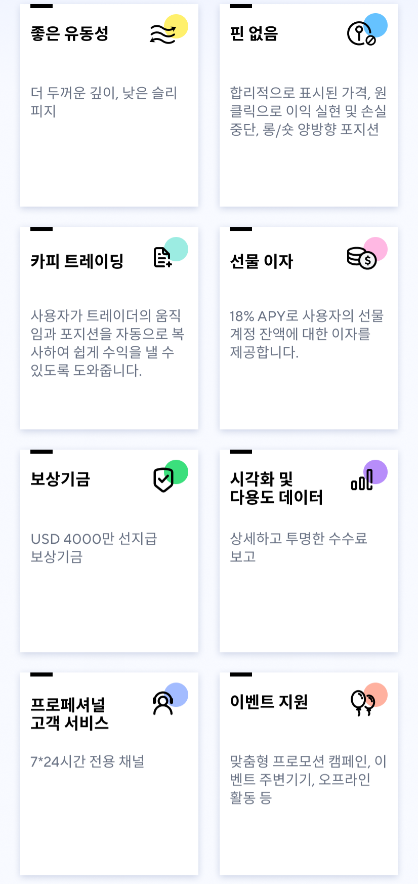 - 전 세계 거래소 중 최고 수준인 하향조정 없는 커미션, 거래량 증가에 따라 추가적인 커미션 요율 상향 가능