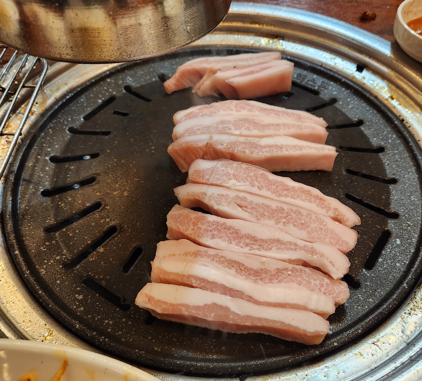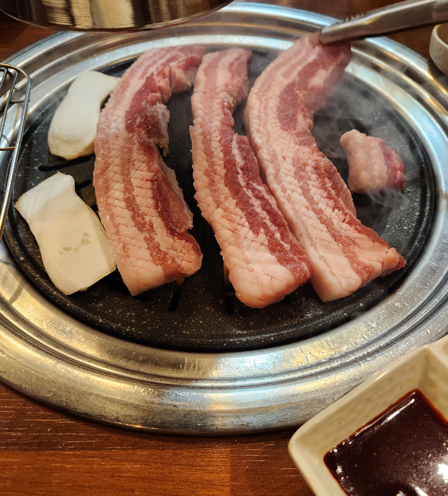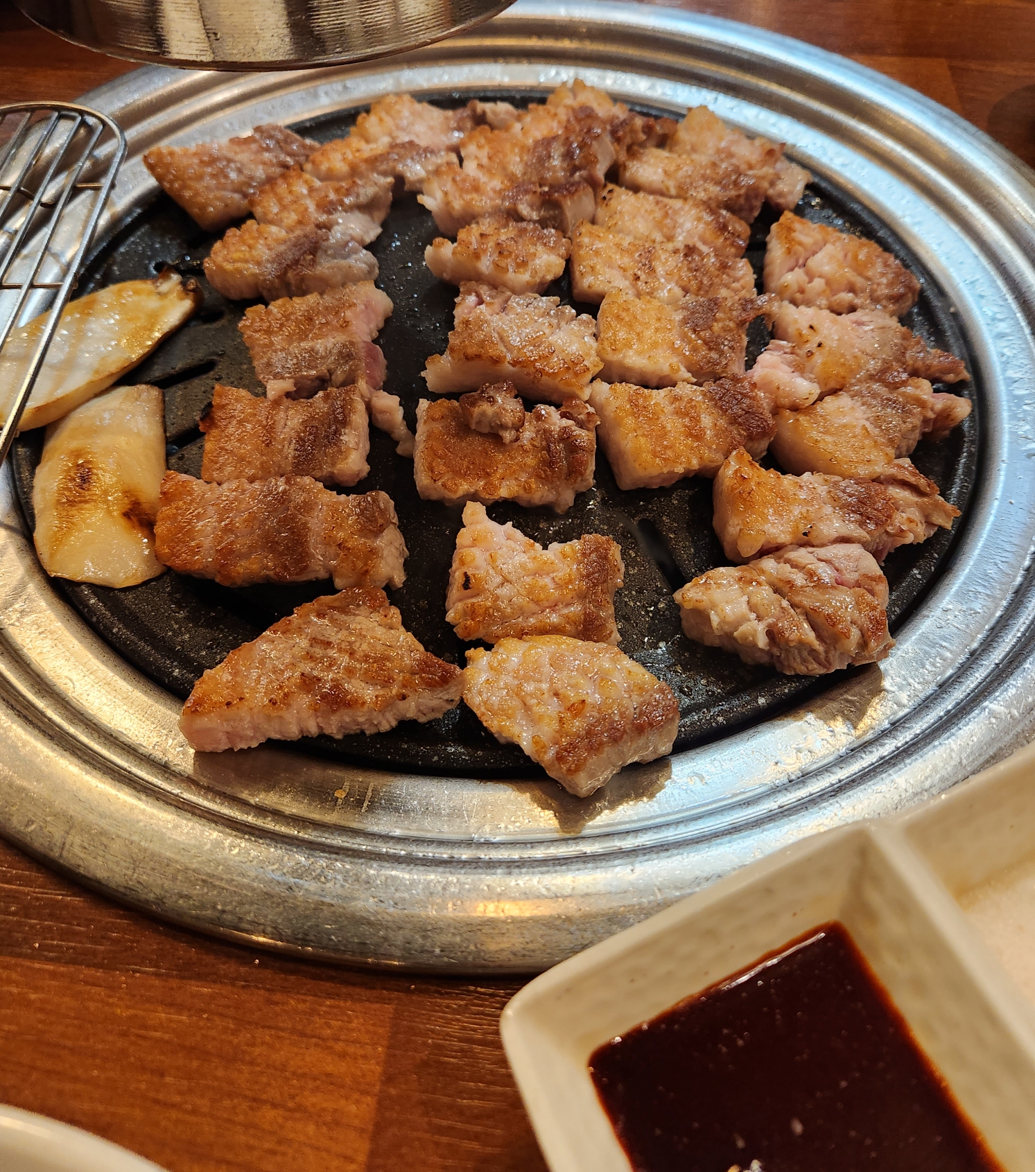 이전에 벌집삼겹살이 유행할때가 있었는데 꽃삼겹살도 벌집삼결삽처럼 고기에 미리 칼집이 들어가있었고 지방과 살코기가 적당히 섞여서 구워주신 고기를 바로 전용 소스에 찍어 먹으면 술이 절로 들어가는 맛이다. 😁