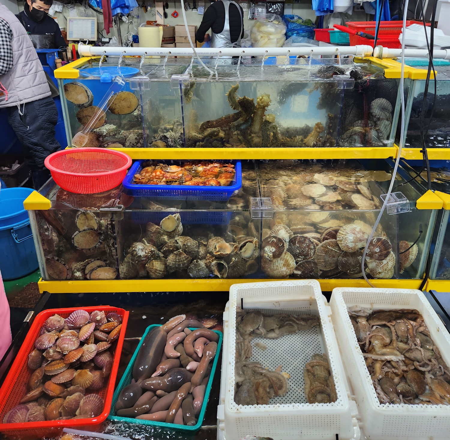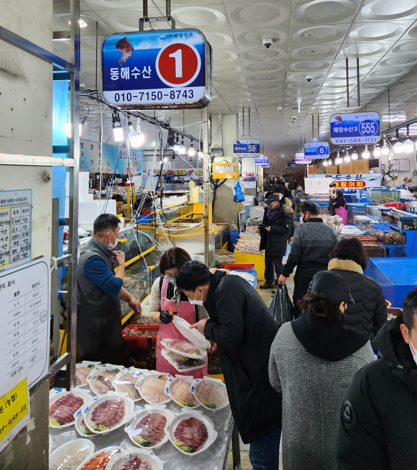 천안이 내륙이지만 서해랑 가까워서 그런지 수산시장이 잘되어있는 것 같다. 바다 옆에 붙어 있는 수산시장과 비교해봐도 별로 다를게 없는 분위기이다.