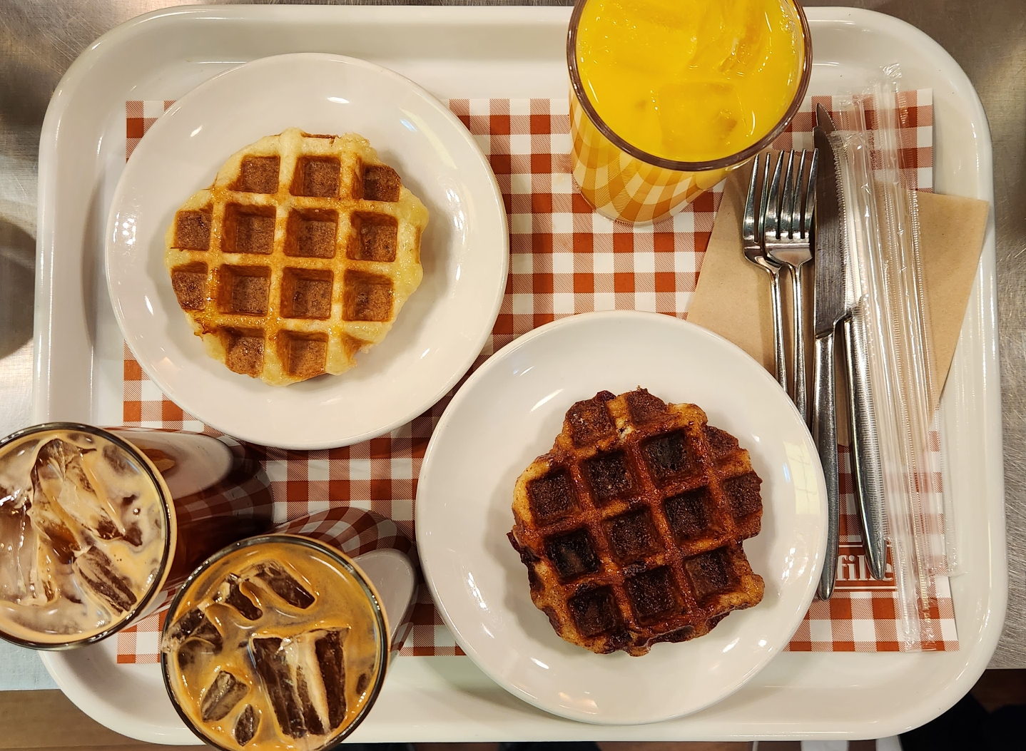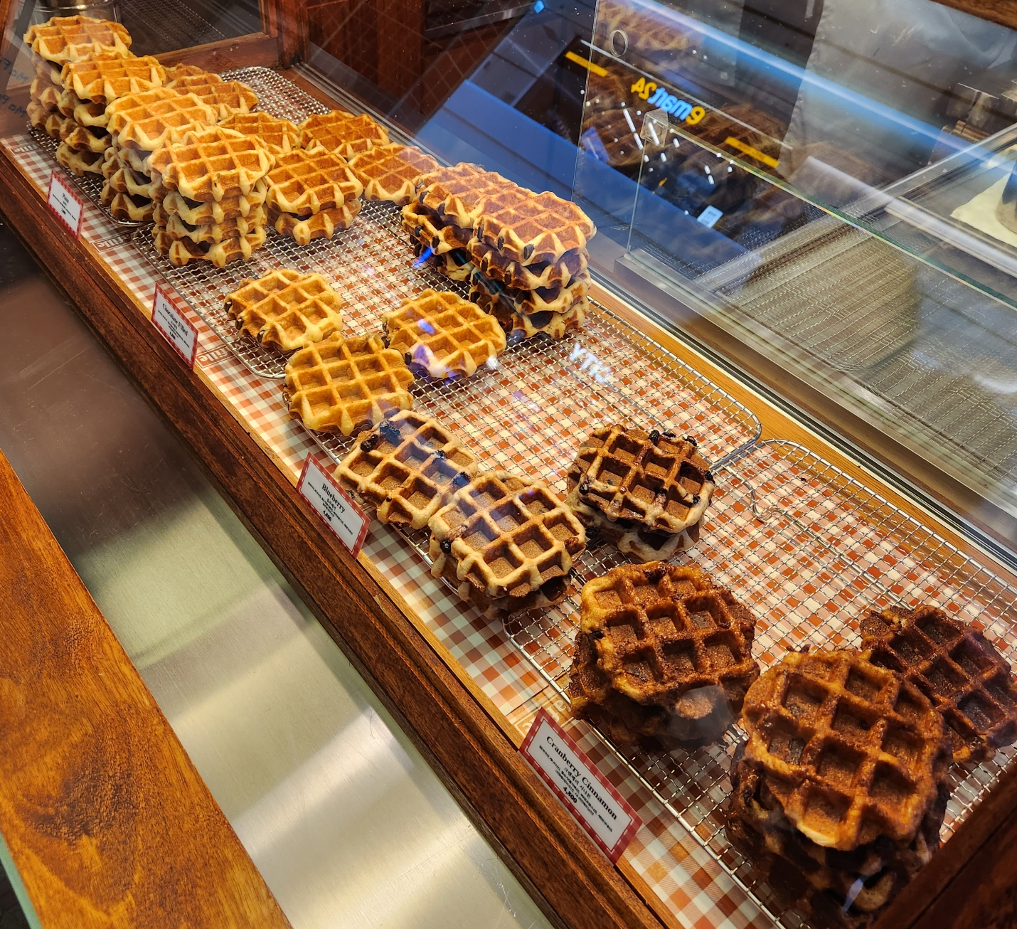 진열되어 있는 와플들이 너무 맛있어 보였는데 그 중 플레인과 크렌베리 시나몬 2개를 주문했다.