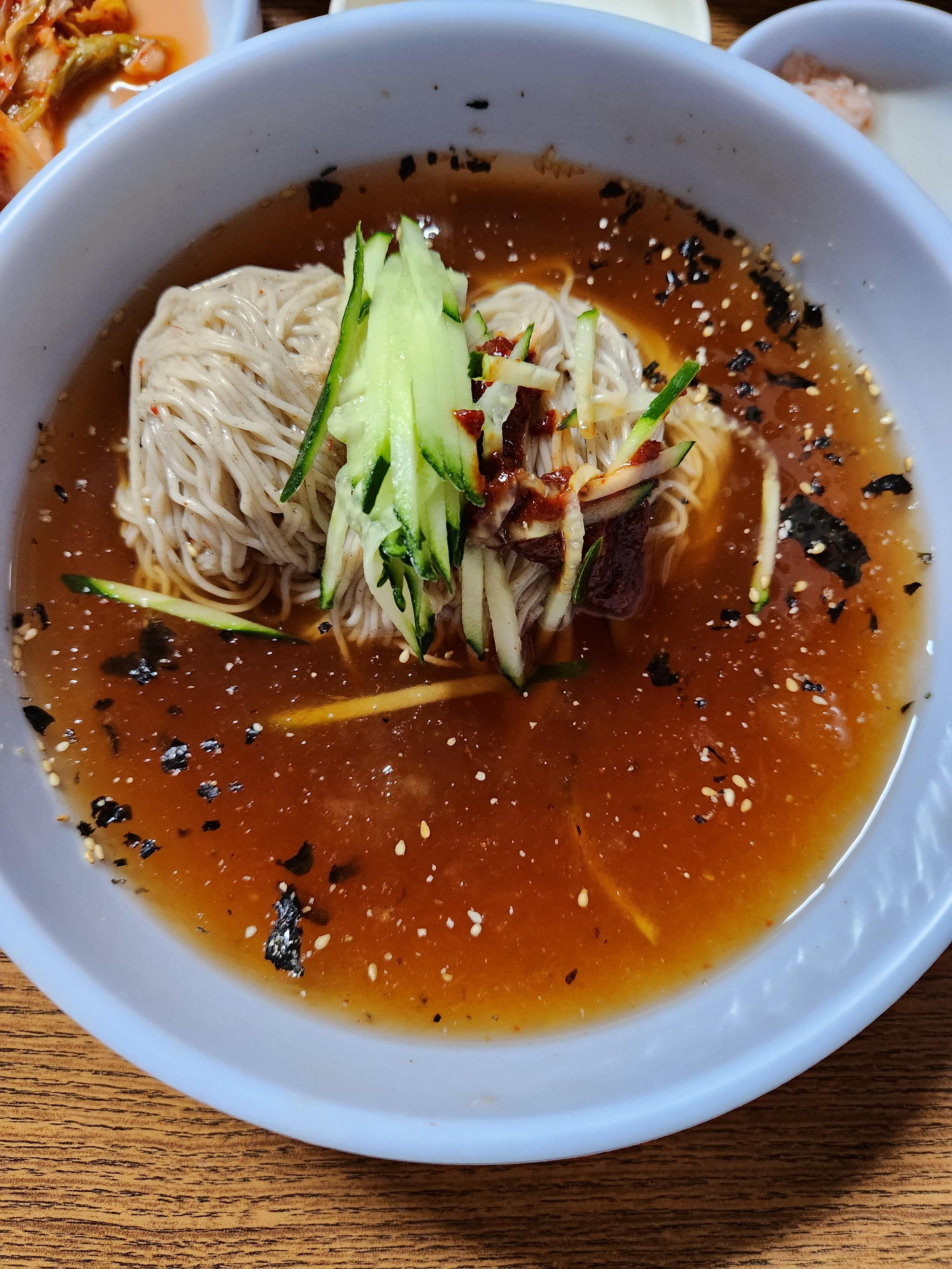 매실? 맛이 느껴지면서 맵지도 밍밍하지도 않은 적절한 양념국물의 맛으로 같이 주문한 편육(보쌈 같은)을 면과 같이 싸서 한입 가득 먹고 국물을 마시면서 같이 먹으면 그 조화가 와 맛있다 고 할 정도로 맛집이다!라는 생각이 듦