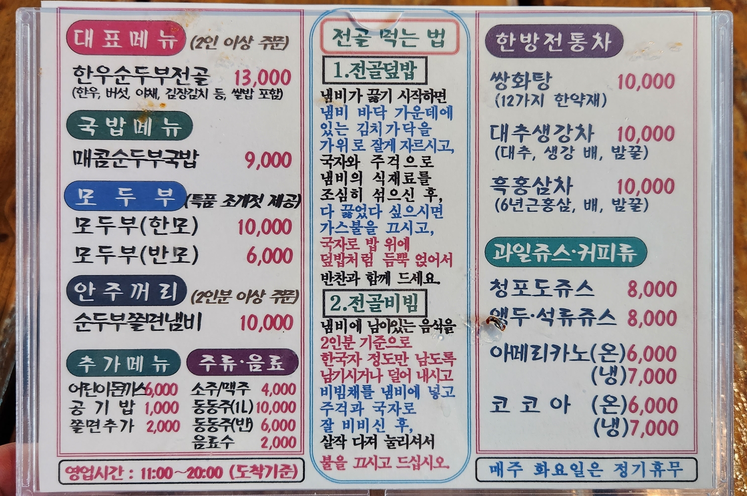 가격 : 한우순두부전골 13,000원 (1인, 주문은2인이상)