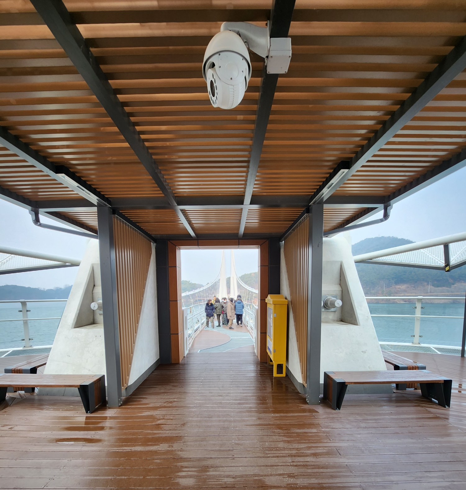 흔들면 흔들리지만 바람때문에 자연스레 옆으로 스윙하던 다리는 긴장감을 더 북돋어 주었고 가운데 쉬는 곳 까지 후다닥 가서야 필자는 맘이 놓여 잠시 쉬면서 와이프와 딸이 오기를 기다렸다. 🤣