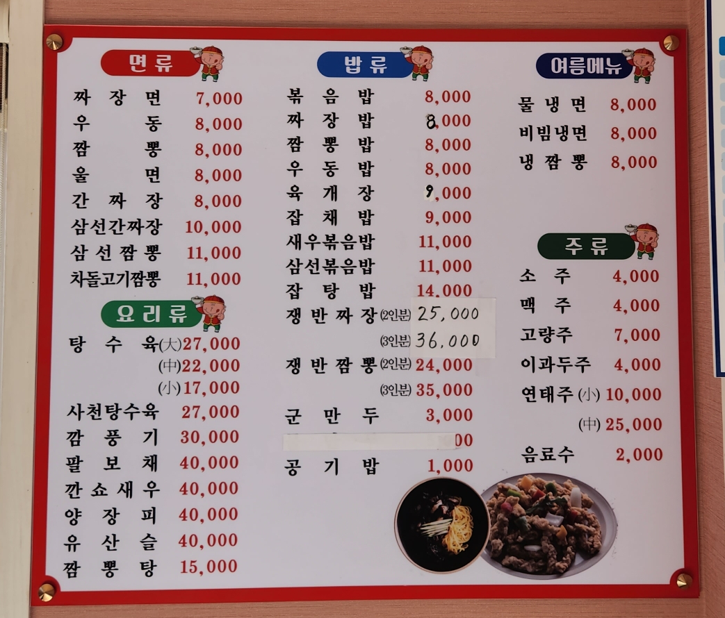 가격 : 자장면 7,000원 짬뽕 8,000원