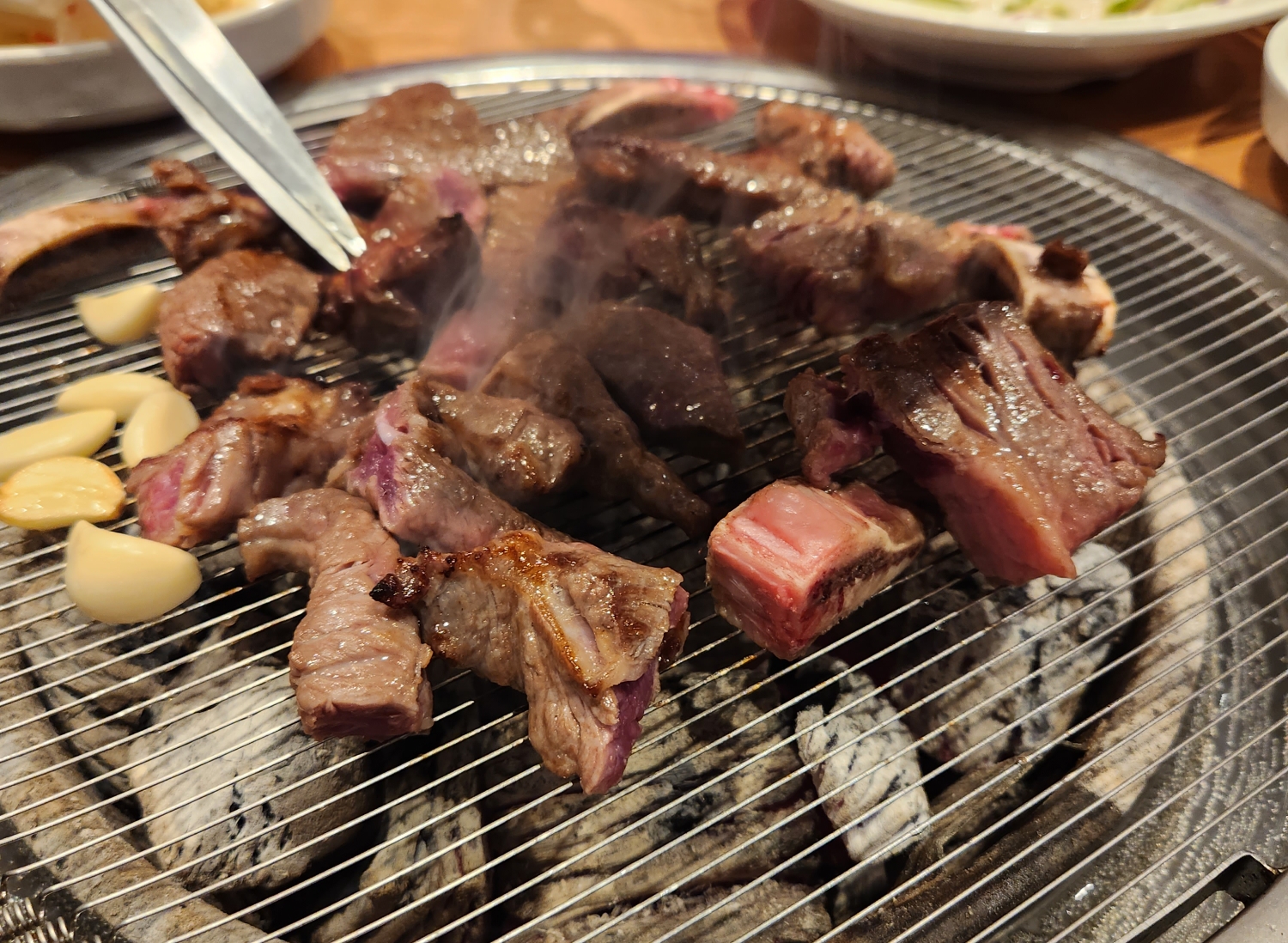 넓적한 통판으로 두꺼운 갈비살이 나오는데 숯불에 구워서 한입 딱 먹으면 육즙이 팡팡 나오면서 너무너무 맛있다.
