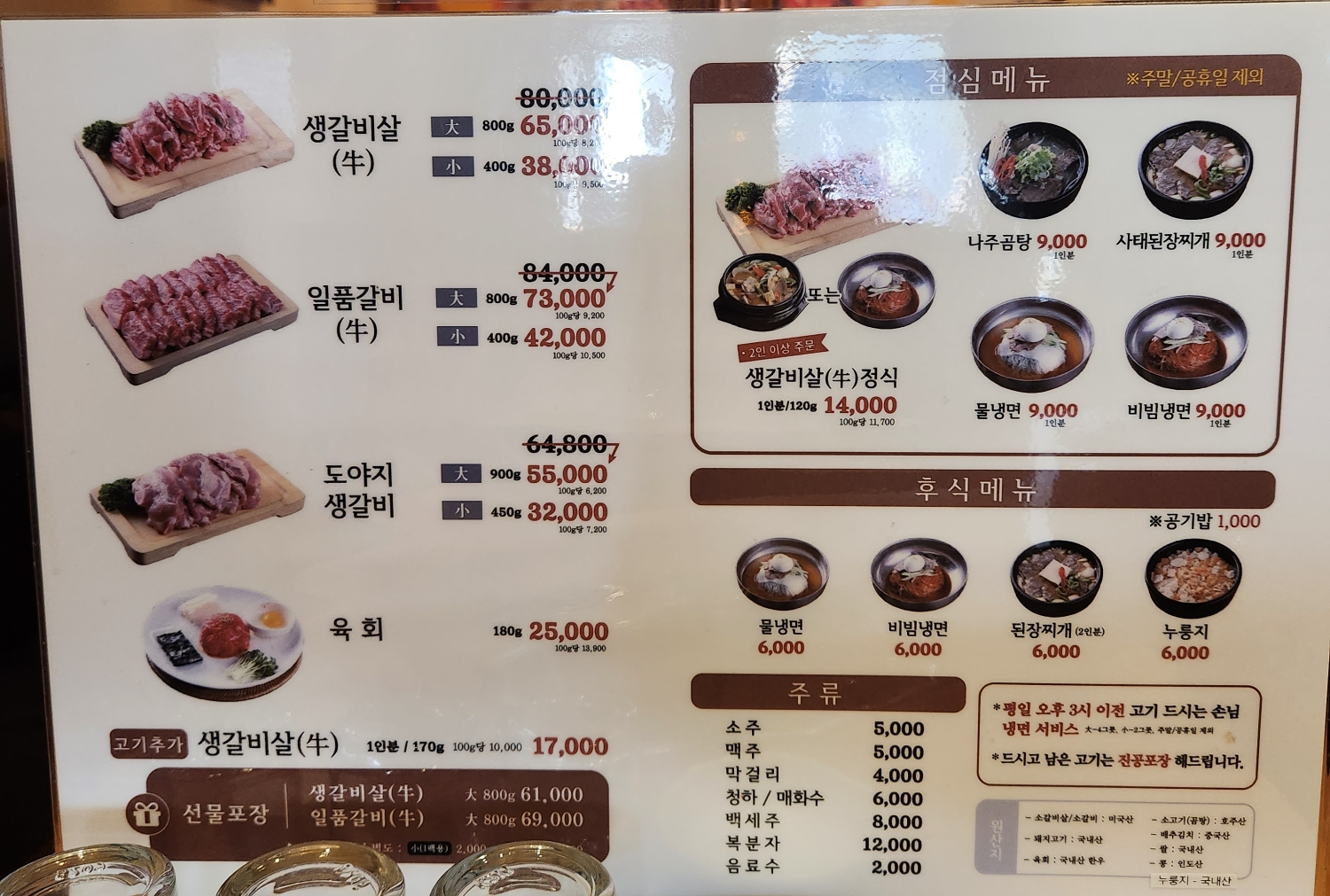 가격 : 생갈비살 800g(대) 65,000원 400g(소) 38,000원