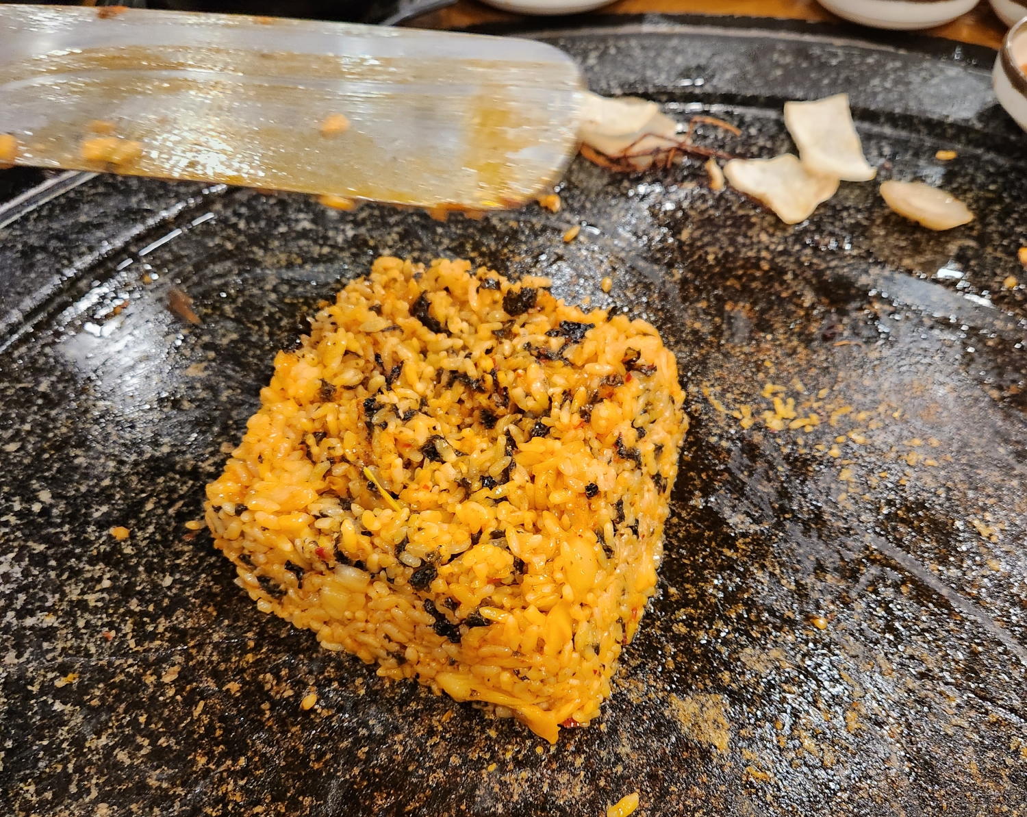 철판에 잘 구워서 볶아주신다. 노릿노릿 밥알을 불판에 잘 눌어붙게 한 다음 바삭하게 먹으면 더 별미다.