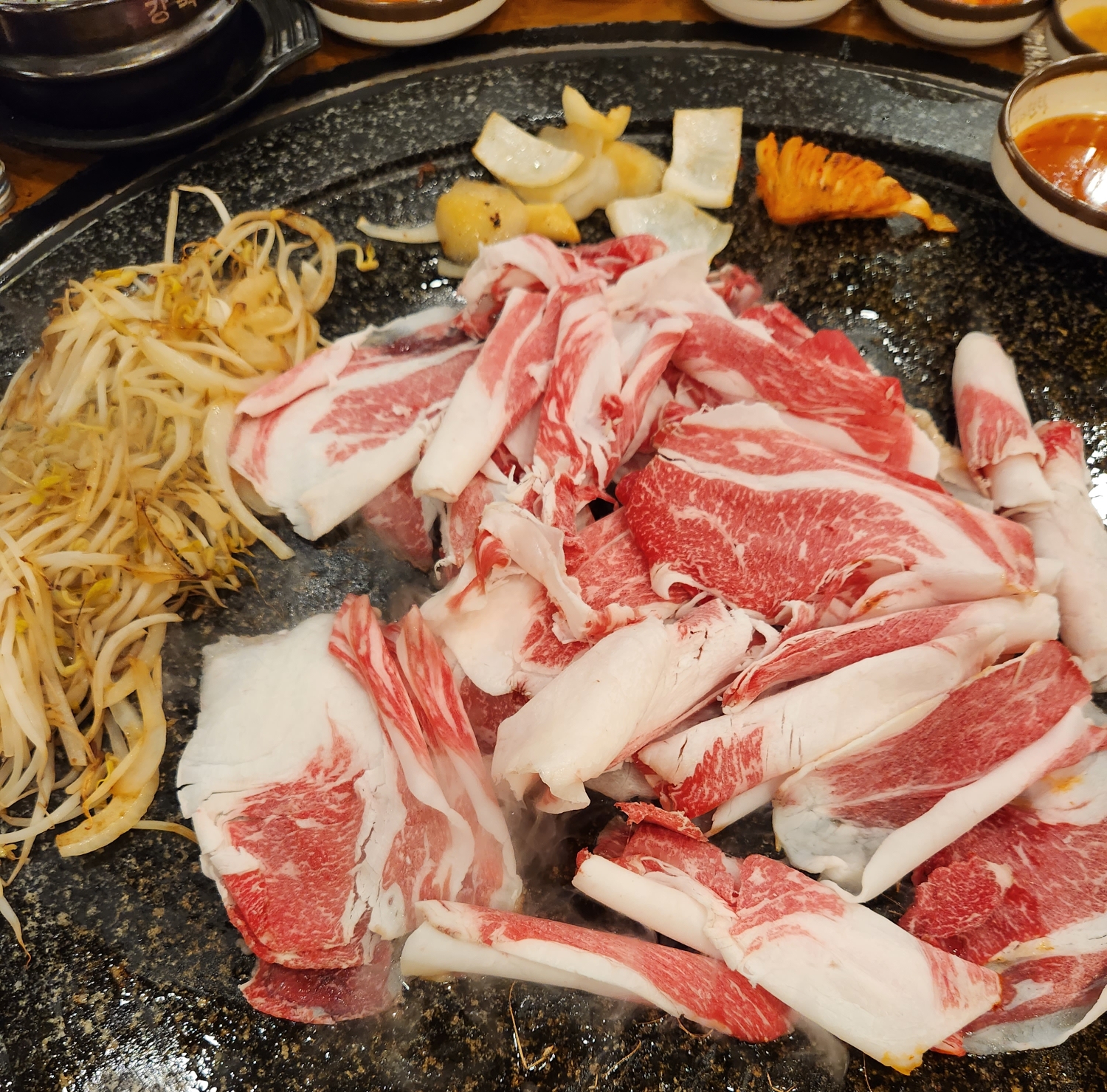 숙주나물을 볶아서(한명회가 생각이난다 😆) 차돌박이 구이와 같이 나오는 특재 새콤한 소스와 한께 딱 먹으면 삼겹살 구이를 먹을 때와는 또 다른 맛이 느껴진다.