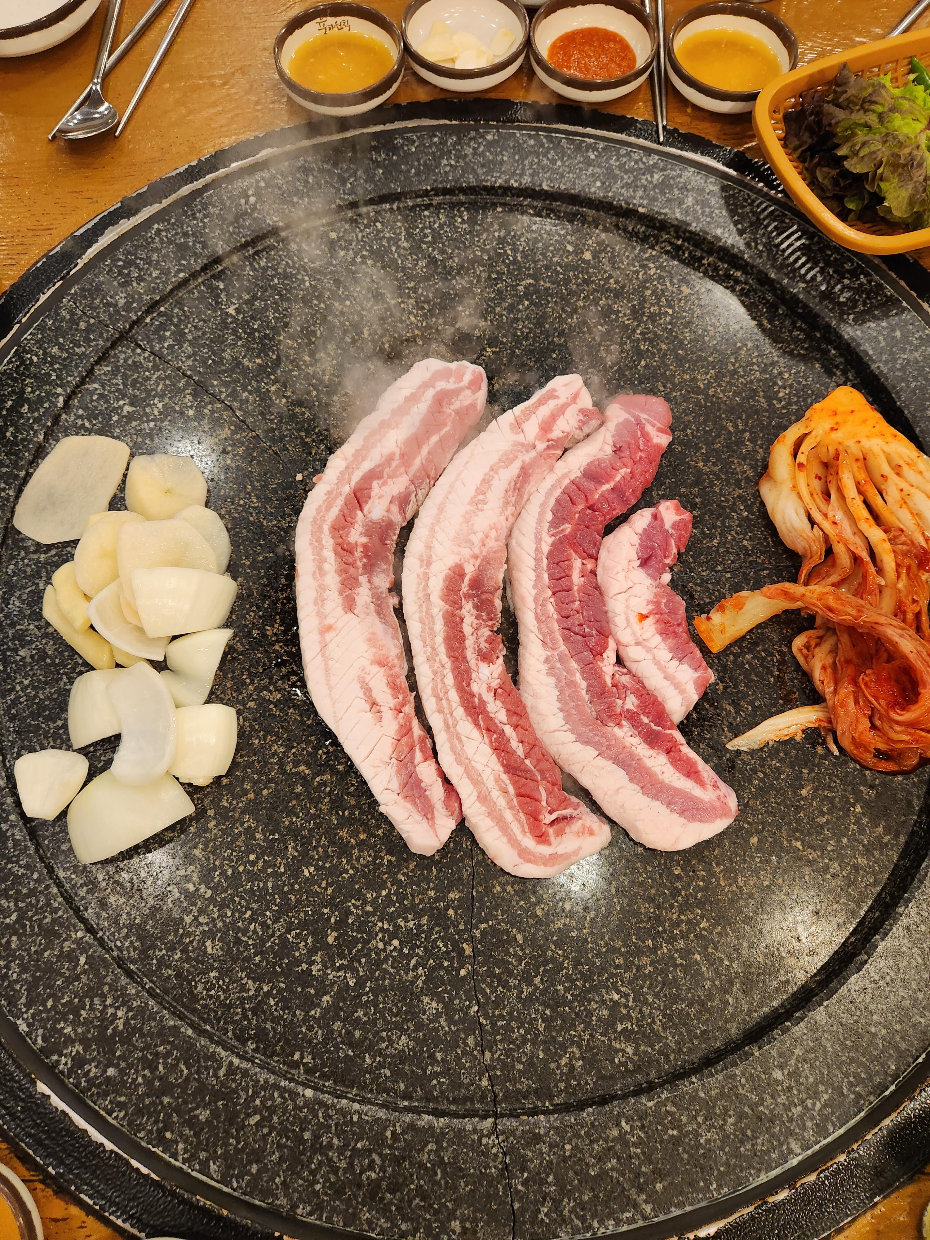 삼겹살은 김치를 구워서 같이 먹으면 맛있다.