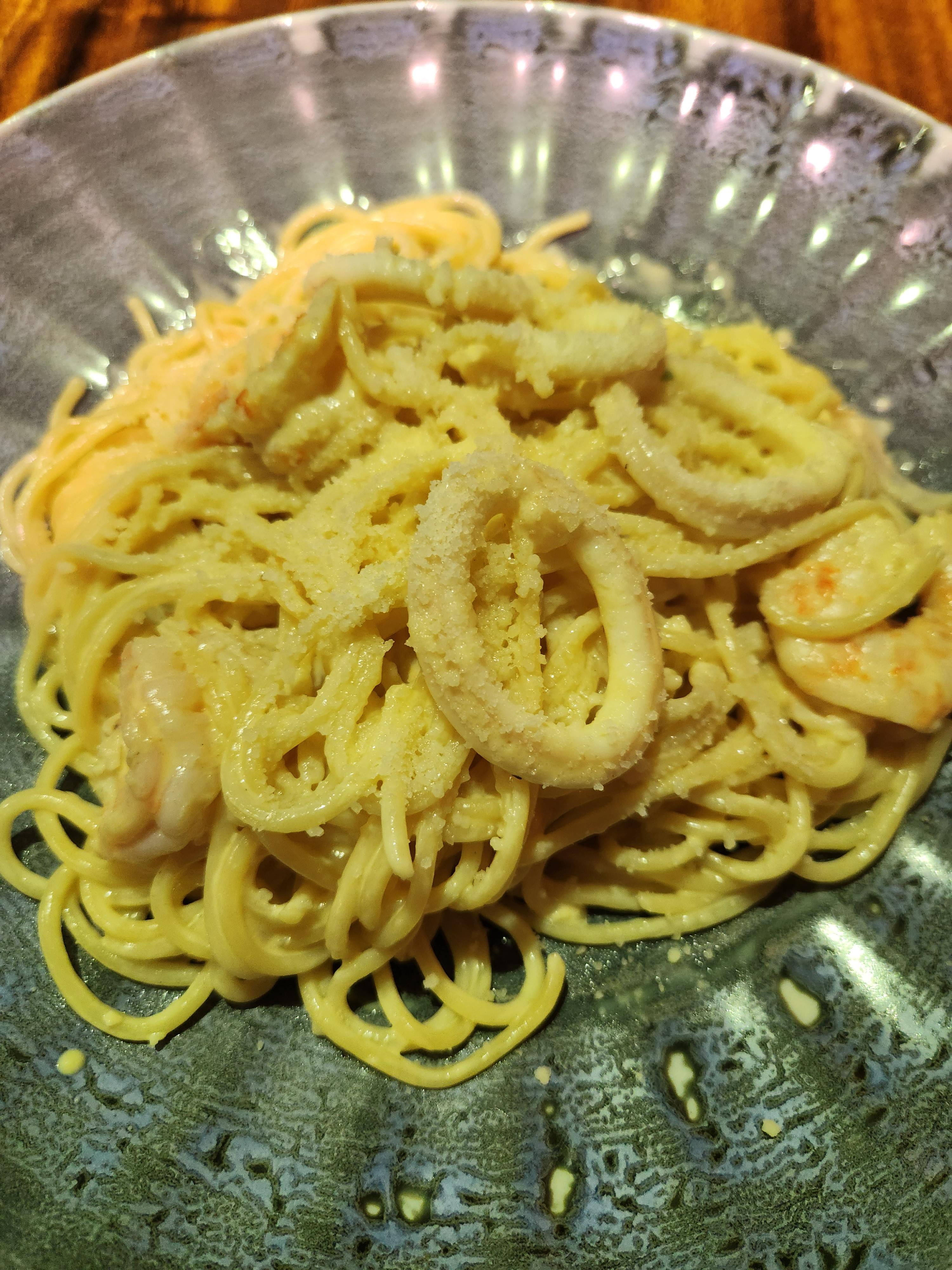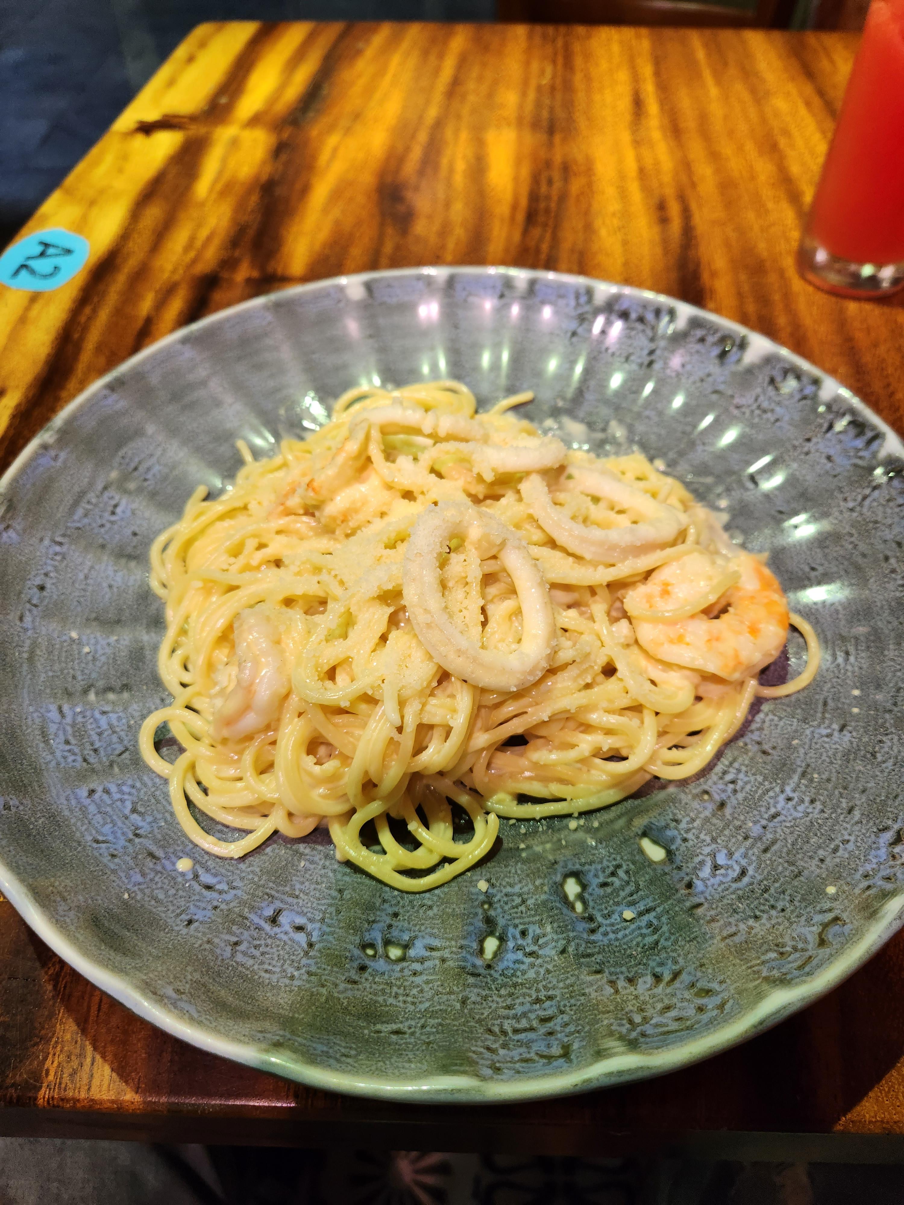이름은 seafood 스파게티인데 왜 오징어만 보였는지 새우를 더 기대했건만 새우는 적었다 .🤣