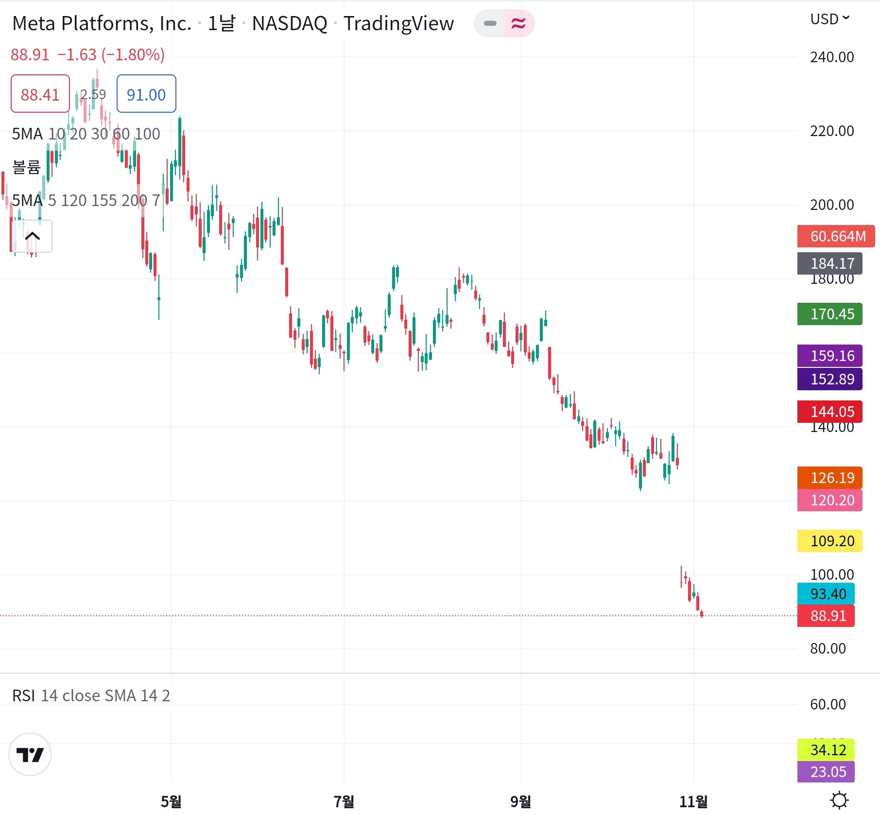 메타는 어디가 저점 일지 모르게 떨어지고 있다.