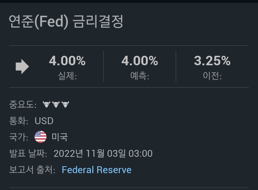 사실 75bp로 시장에서 예상하는 그대로여서 별 다를 건 없었다. 성명서 문구에도 인플레이션 2%대를 위한 금리정책은 지속되어야 하고 적절하다는 것과 향후 속도는 늦춰질 수 있단 식으로 얘 긴 했지만 최종 목표는 높아진다는 질의응답에 시장은 반응을 한 것으로도 지수에 반영한 것 같다.