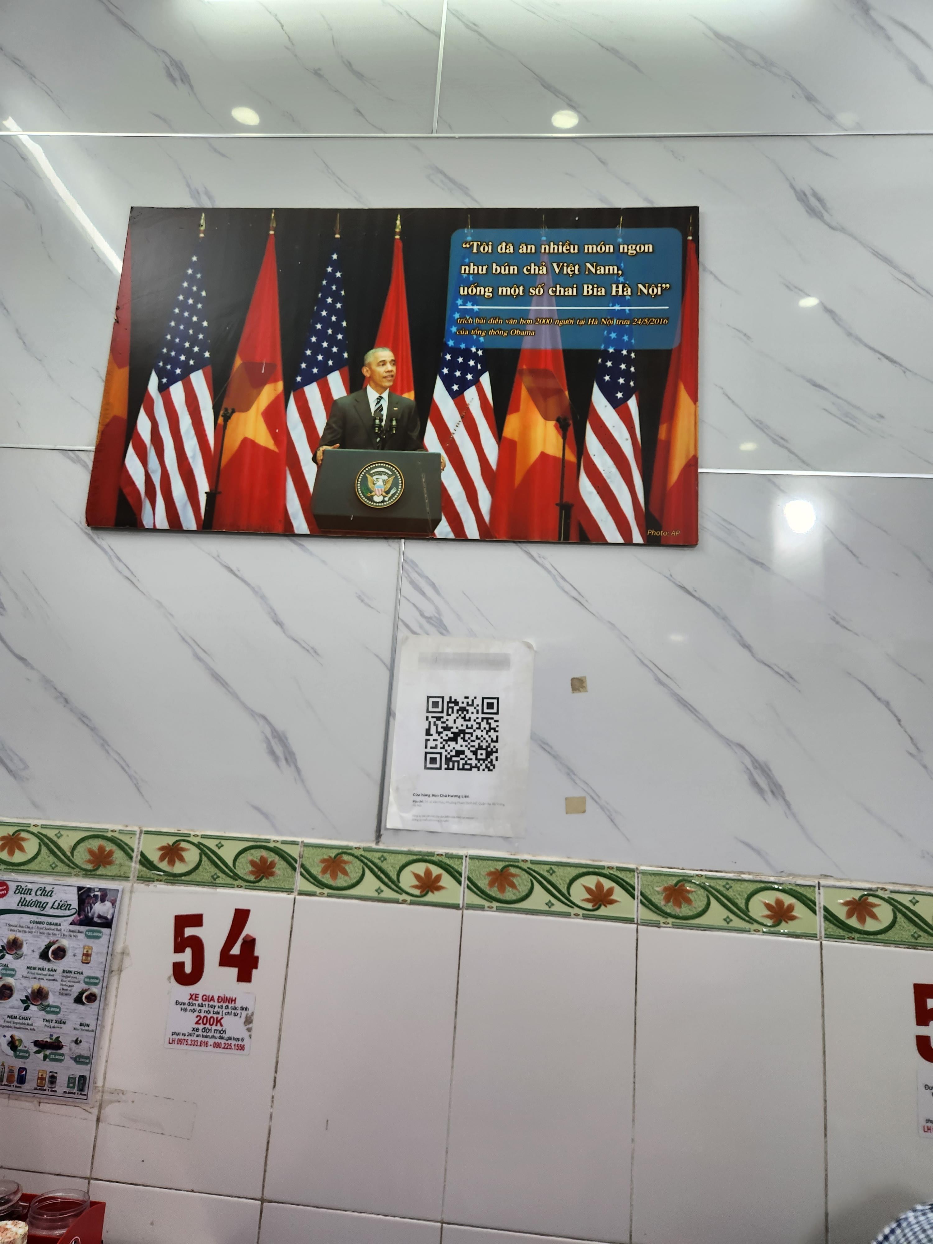 분짜 흐엉리엔은 들어가면 벽에 오바마가 방문했던 사진들을 액자로 잘 붙어 있다.