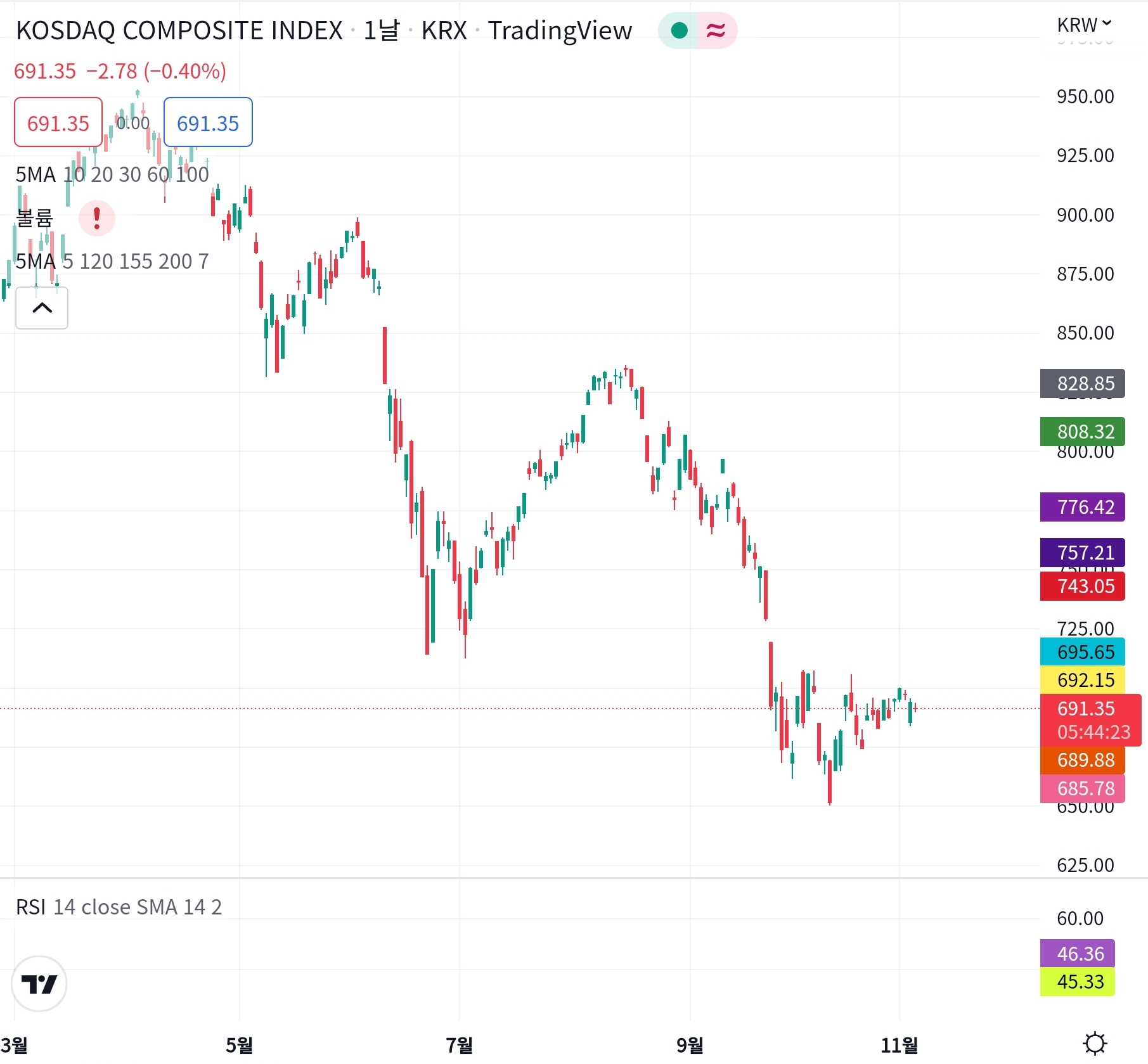 단지 매파적인 발언으로 인해 때맞춰 나스닥 및 기술주들의 하락 행진이 이어졌고 이틀 연속 저점에서 지속 공포와 투자를 하는 사람들에겐 절망적인 지수로 보인다.