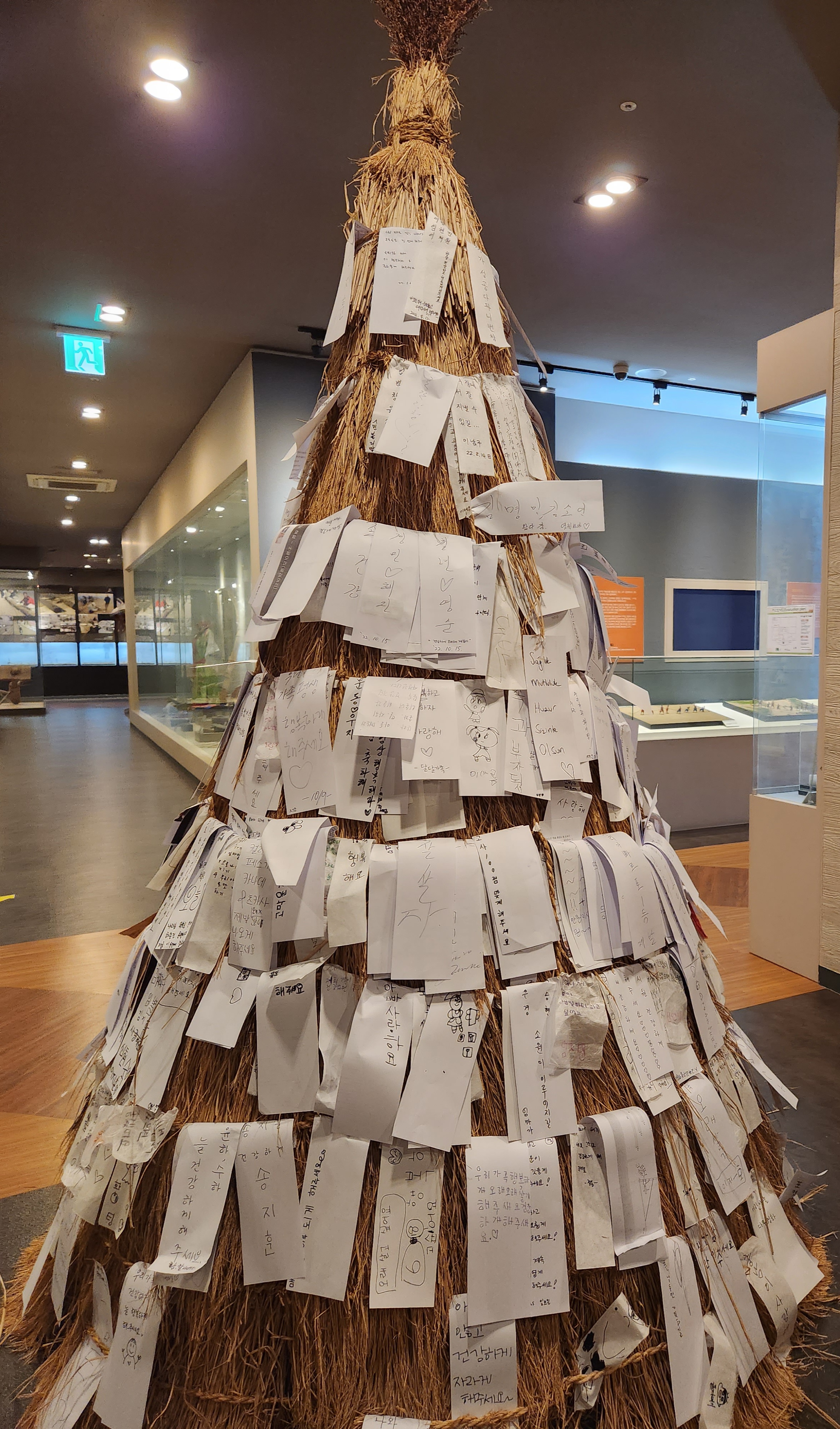입구로 들어가는 2층 관람 마지막 구간에는 종이에 소원을 써넣는 곳도 있어 간단히 우리도 아이들이 소원을 적도록 해서 걸어두고 왔다. 이면지에 아이들이 쓰고 짚으로 만든 것 같은 트리에 (아마 줄다리기를 하는 줄을 꼬으는 짚을 재료로 해서 상징적으로 만든것으로 보인다.) 여러 아이들이 소원을 걸어 둔 종이 한켠에 같이 걸어두면 된다. 우리가 갔을 땐 펜은 하나밖에 없었는데 여러 색의 펜을 들고 계신 분들이 라면 좀 더 다양한색으로 글씨를 써둘 수도 있을 것 같다.