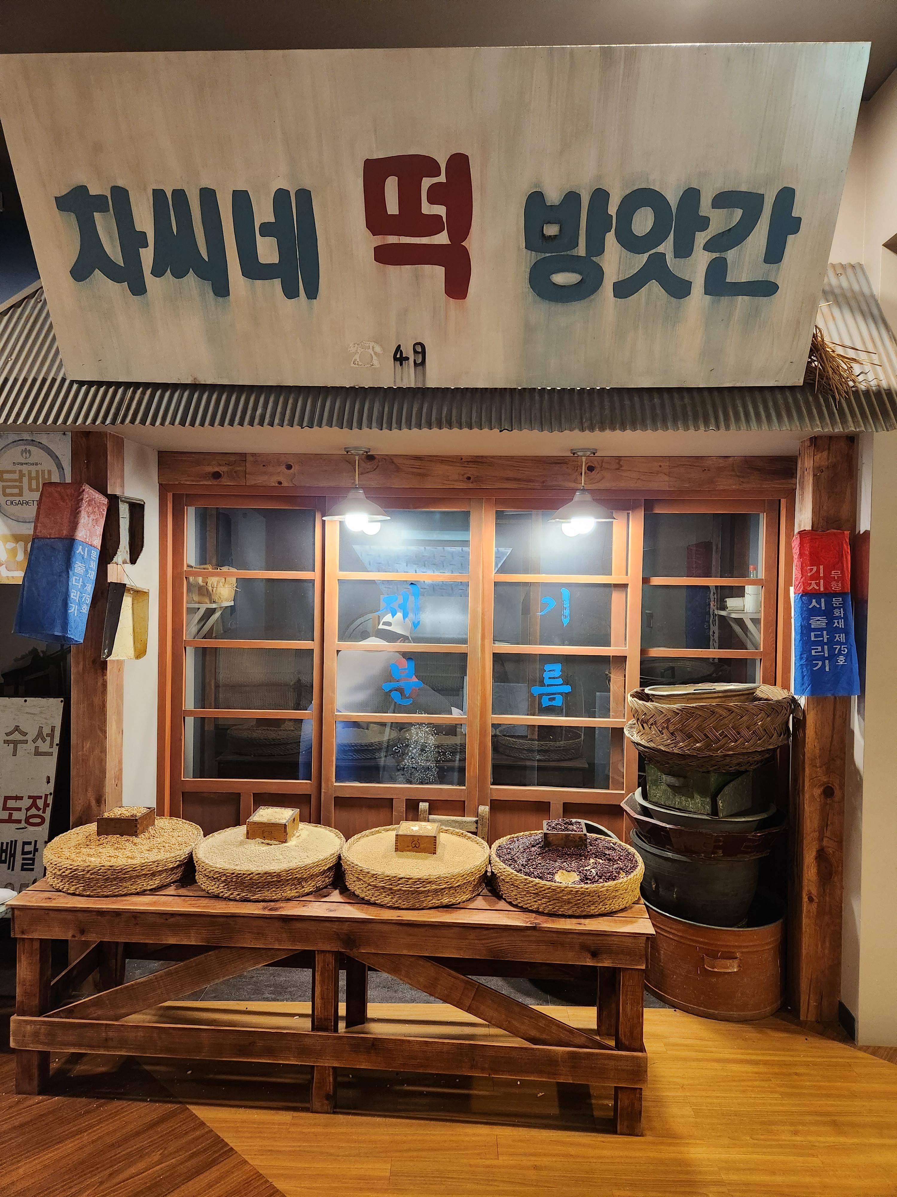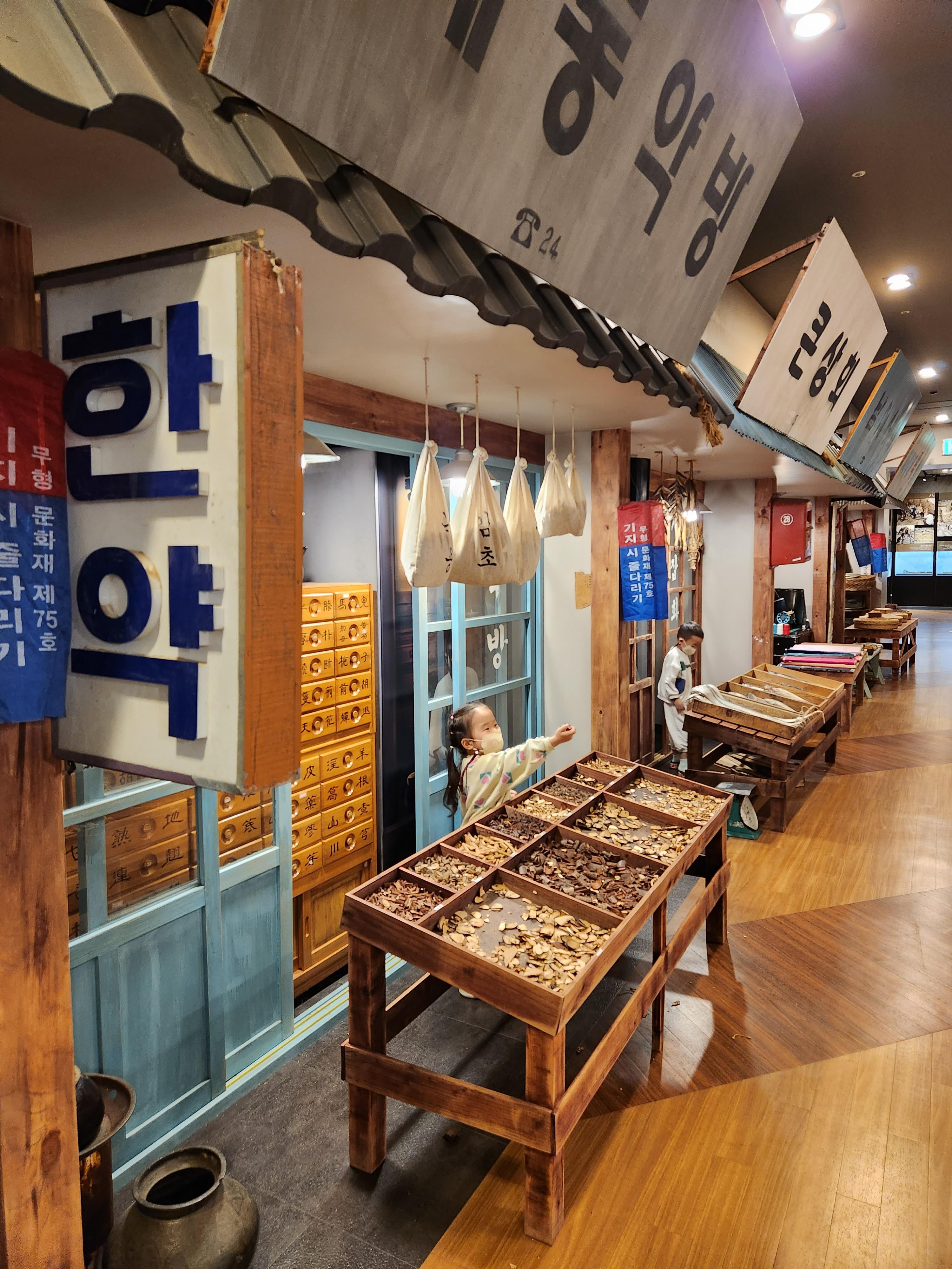 한쪽의 길에는 옛 모습을 그대로 재현해둔 사진찍기 좋은 곳도 있다. 아이들에게 옛날에는 이런곳에서 물건을 팔기도 했다고 설명을 해주며, 직접 사장님처럼 대해 보기도 하고 쌀,팥,조등 파는 떡방갓간 모습, 생선 파는 큰 상회, 한약재 파는 약방등 영화에서만 보거나 할머니 시대에 있었던 풍경을 보니 나도 반갑고 재밌었다. 😆