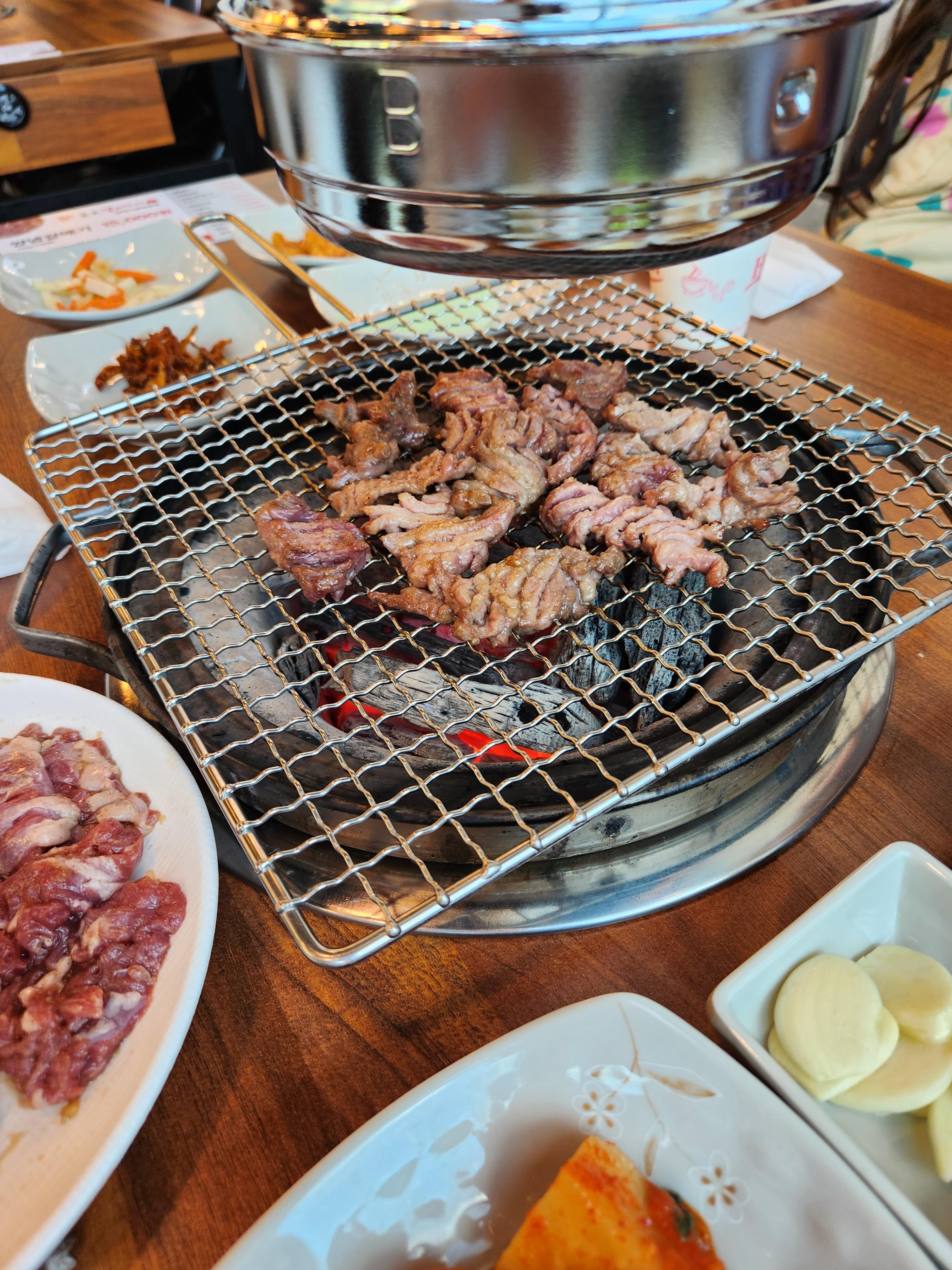 위에 보이는 금색 조형물이 정문인데 바로 앞에 있기에 맛집을 찾아보다 멀리 가지 않고 걸어서 가보자고 하며 우리 가족은 점심특선을 먹자 하고 들어갔는데, 아차, 점심특선은 평일만 되는 거였음 😂 다시 어디 가기엔 시간도 그렇고 그냥 고기를 2인분 구워 먹기로 함 🤤