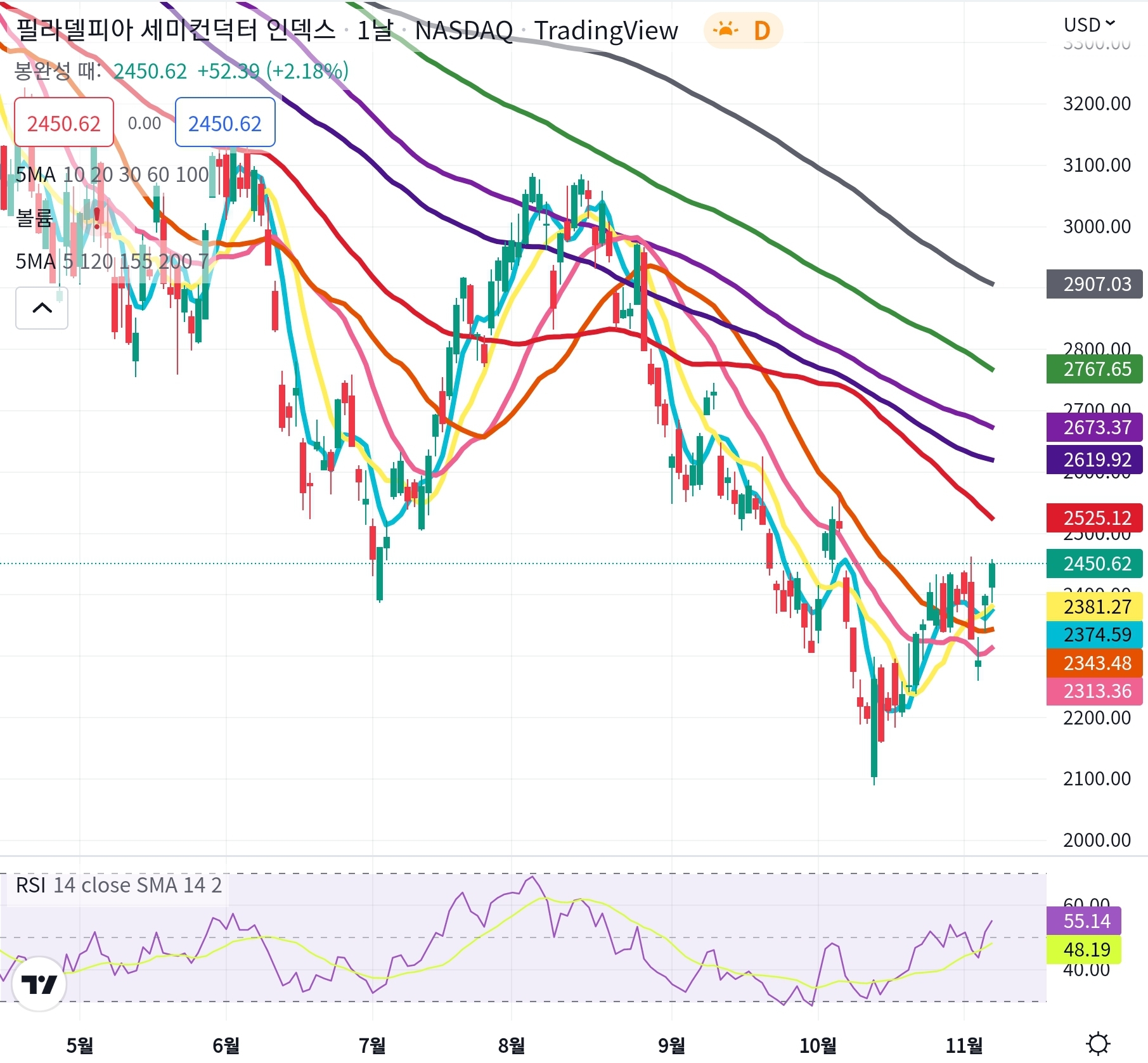아쉬운 점은 나스닥에서 가장 파워풀한 애플이 차트가 꺾여 상승에 힘이 좀 꺾인 상황인데 그에 반해 그동안 또 지속해서 내려가기만 하던 반도체 지수들이 고개를 들고 상승 동력을 이어나가고 있다.