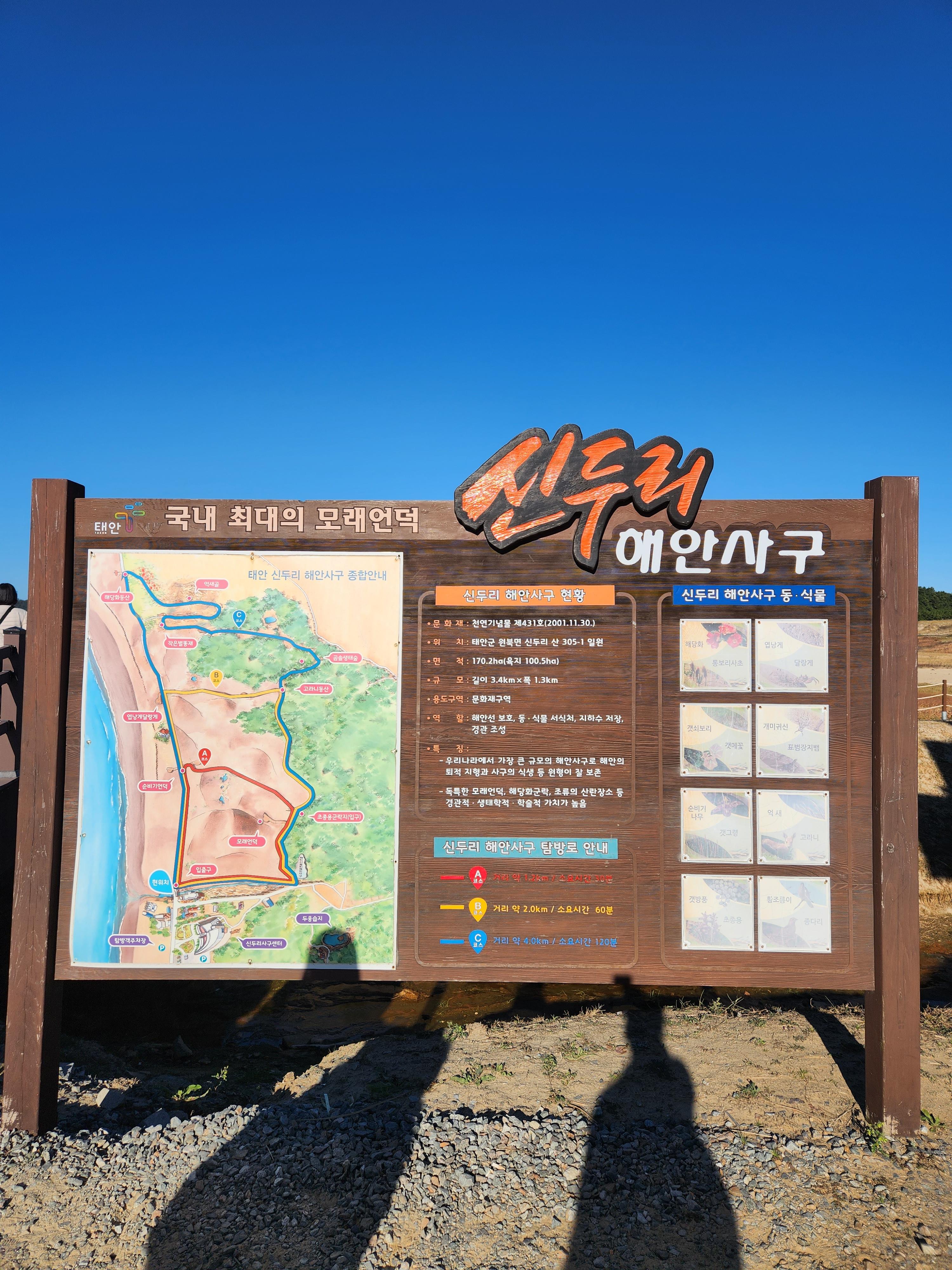 신두리 해안사구는 서해의 바다에서 날아오는 모래바람이 사막처럼 쌓이면서 자연스럽게 생긴 사구로 유네스코 문화재로도 등재되어 있다는 걸 알게 되었다. 그리고 국내 최대 크기의 해안사구라고 한다.