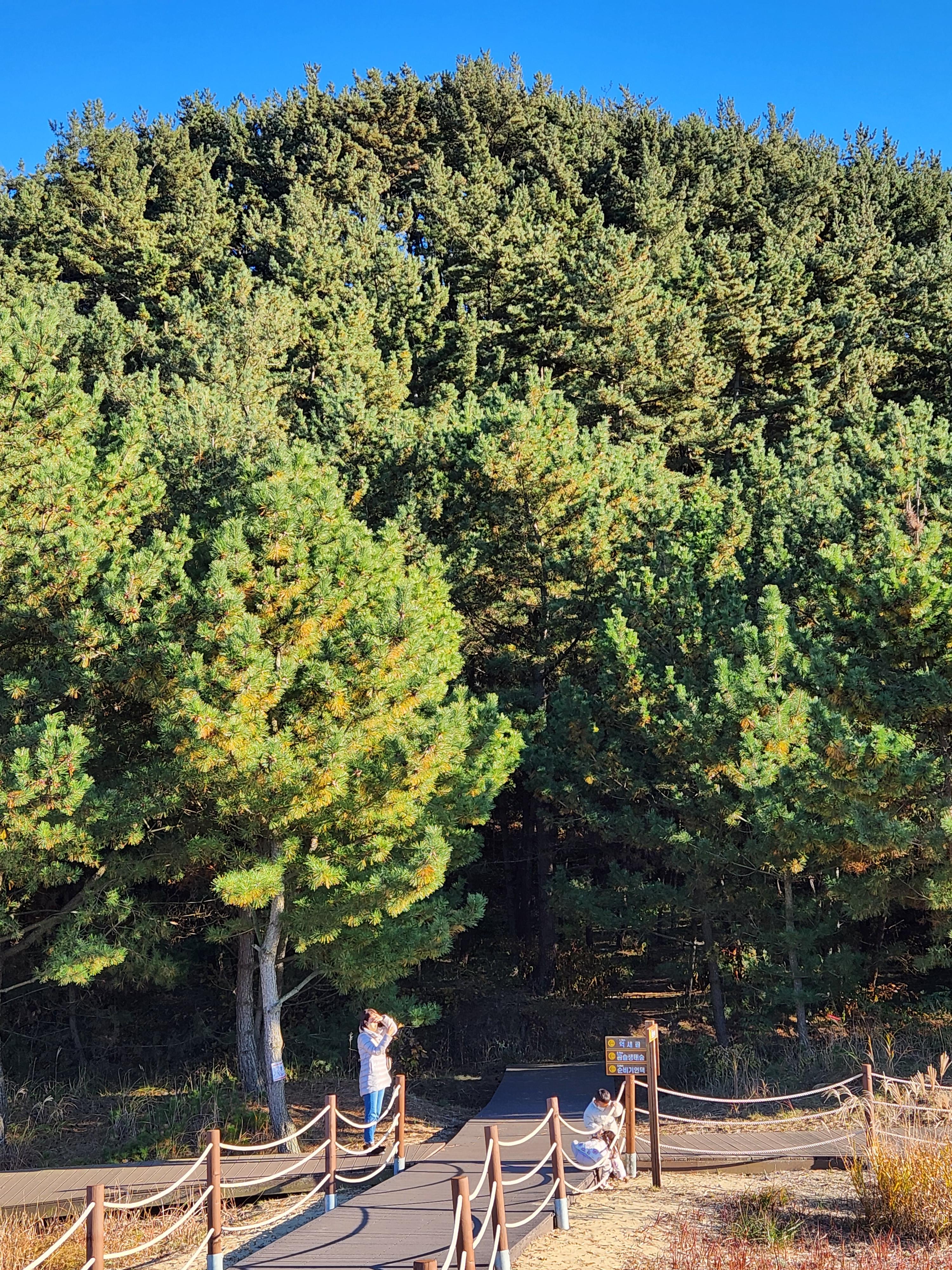 두웅습지를 가는 쪽 입구에서 모래 언덕 쪽에 가는 첫길에 있는 첫 번째 소나무가 그 당시 모래 벌판에서 수십그루의 나무는 죽었지만 살아남아 뒤쪽의 소나무 숲을 만들어준 몇 안되는 1세대 시조 나무? 같은 종자라고 들었다. 😮