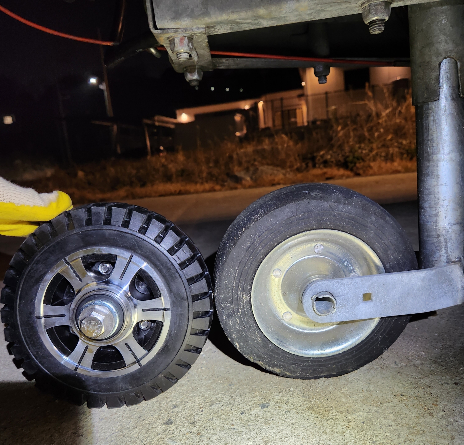 유럽식 카라반 앞바퀴 텅잭 교체를 직접 해보았다. 이전에 쟈키휠 쪽 아래 바퀴를 통고무 타입으로 파쇄석에서도 뜯겨나가지 않고 견고한 걸로 교체를 했는데 고무바퀴만 교체를 해도 바퀴를