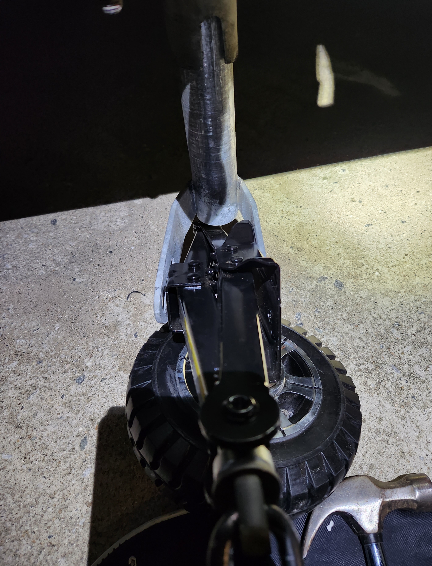 그다음엔 쟈키로 바퀴 휠 넣는 부위를 벌려준다. (기존의 바퀴보다 통고 무형식의 바퀴가 더 크기 때문에 약 10cm는 벌려줘야 한다. 근데 텅잭마다 다르겠지만 내가 쓰던 건 벌려도 다시 어느 정도 탄성이 돼서 돌아와 버려서 쟈키를 벌린 상태에서 바퀴를 못 집어넣으니 어느 정도만 쟈키로 벌려주고,