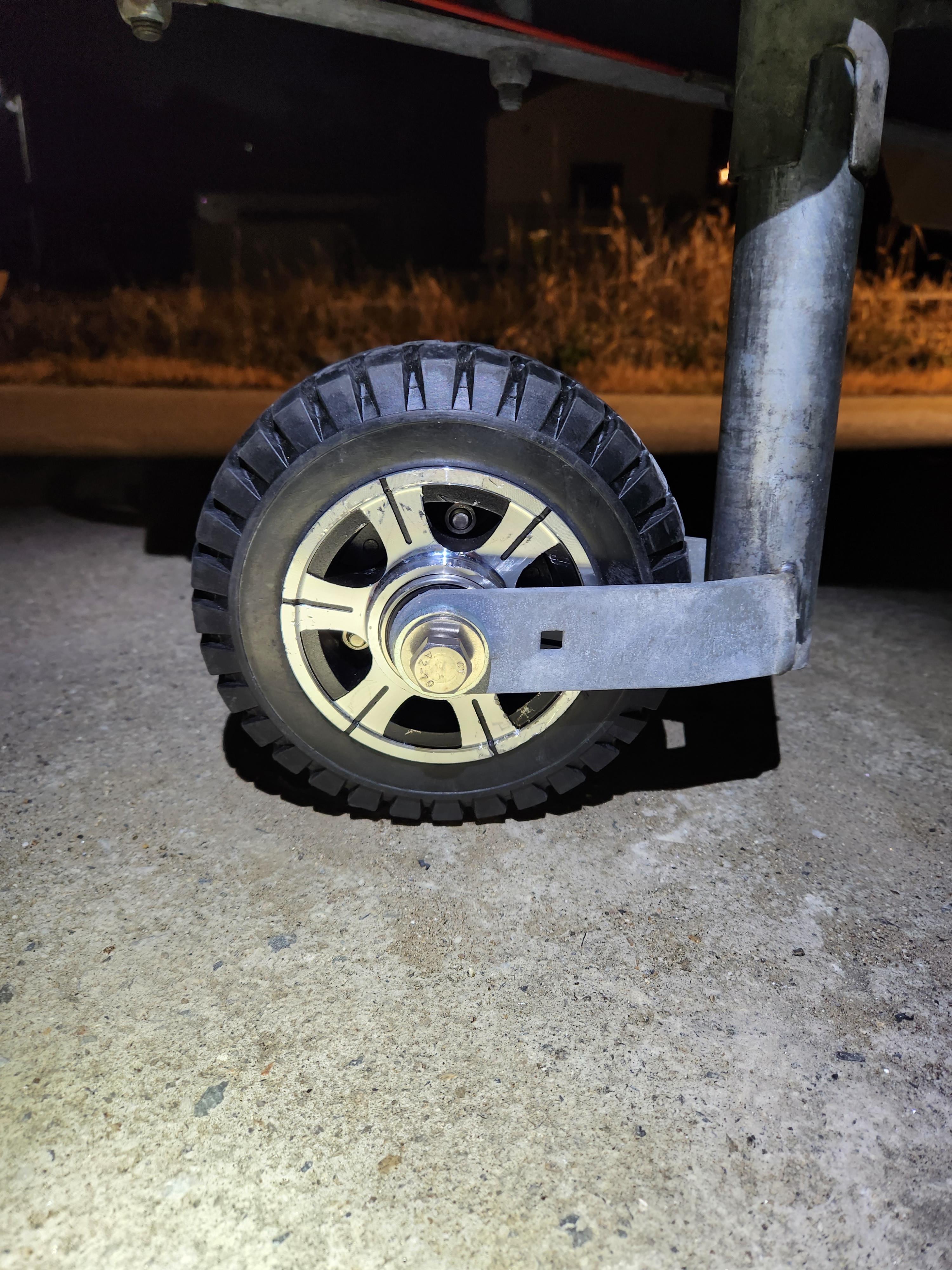 카라반으로 노지를 주로 몇 번 다니다 보니 주차할 때 무버로 위치를 좀 디테일하게 움직여서 주차를 하고 있는데 좀 좁은 곳이나 땅의 굴곡이 있는 곳들에서 좌우로 많이 움직이고 자리를 잡았더니 텅잭 휠이 살짝 휘어지면서 움직이게 되고 점점 바퀴도 고무가 다 떨어져 나가 버렸다. 😭