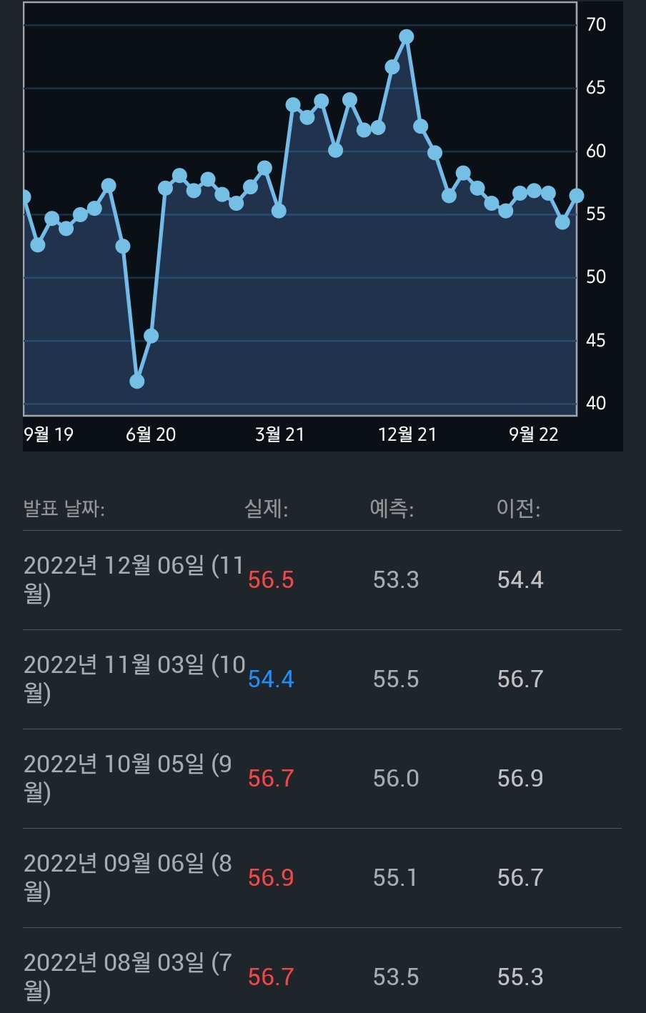 한국 새벽 00시각으로 미국 ISM 비제조업구매자 지수 발표가 있었다. 예상치를 상회하는 결과로 쉽게 생각하면 비제조업의 경기가 탄탄하므로 연준의 금리 인상 정책에 부담을 덜어주는 효과로 나타날 수 있고 그에 맞춰 미국 증시도 조정을 받았다.