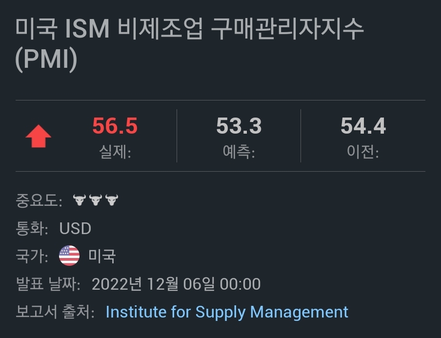 한국 새벽 00시각으로 미국 ISM 비제조업구매자 지수 발표가 있었다. 예상치를 상회하는 결과로 쉽게 생각하면 비제조업의 경기가 탄탄하므로 연준의 금리 인상 정책에 부담을 덜어주는 효과로 나타날 수 있고 그에 맞춰 미국 증시도 조정을 받았다.