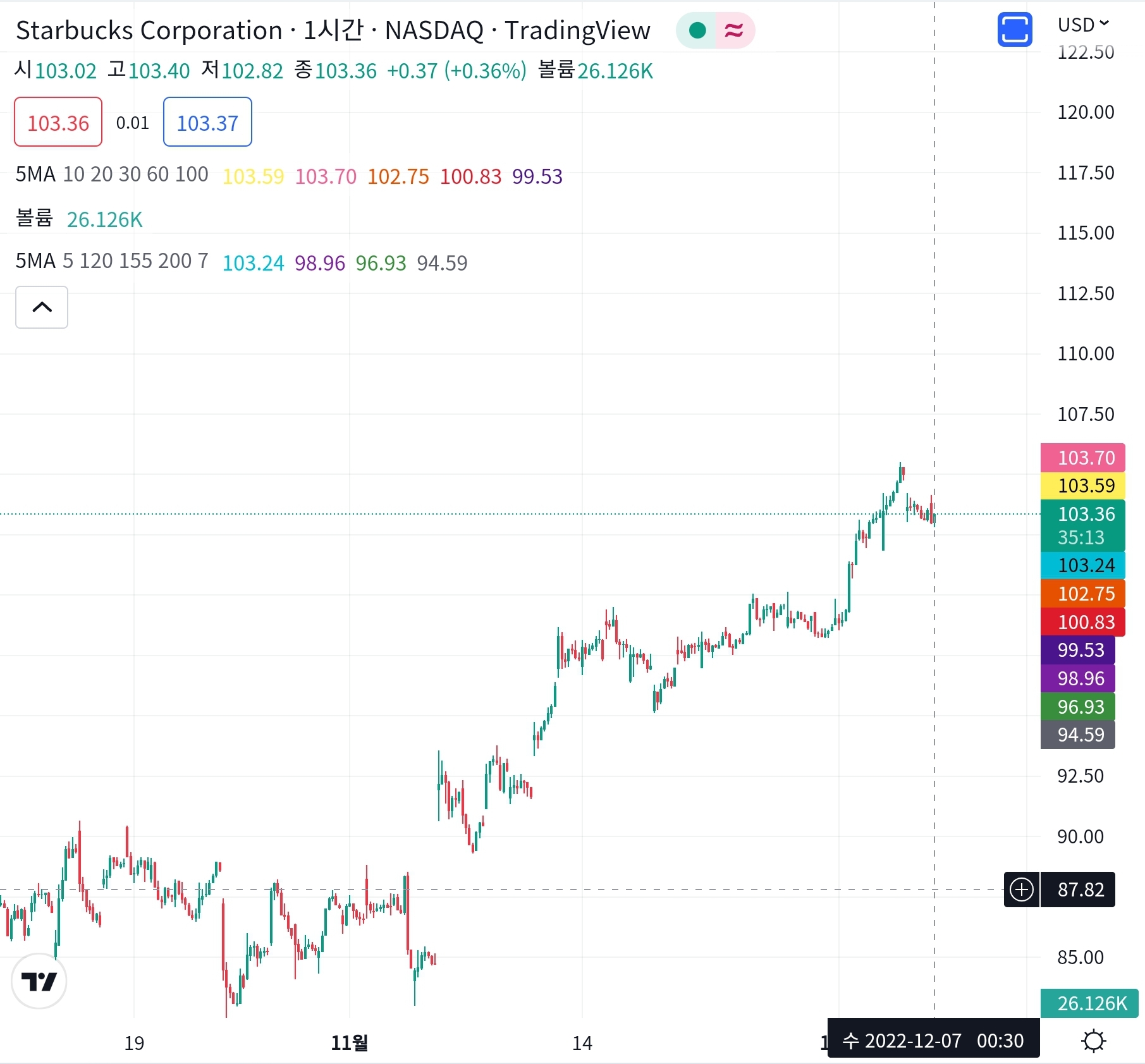 S&P500지수 또한 조정을 받고 있는데 잘 나가고 있는 스타벅스 등에 상승 힘을 꺽지 않을 정도만 조정이 나와주었으면 좋겠다.