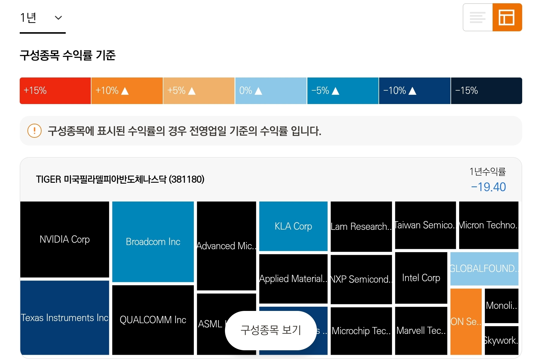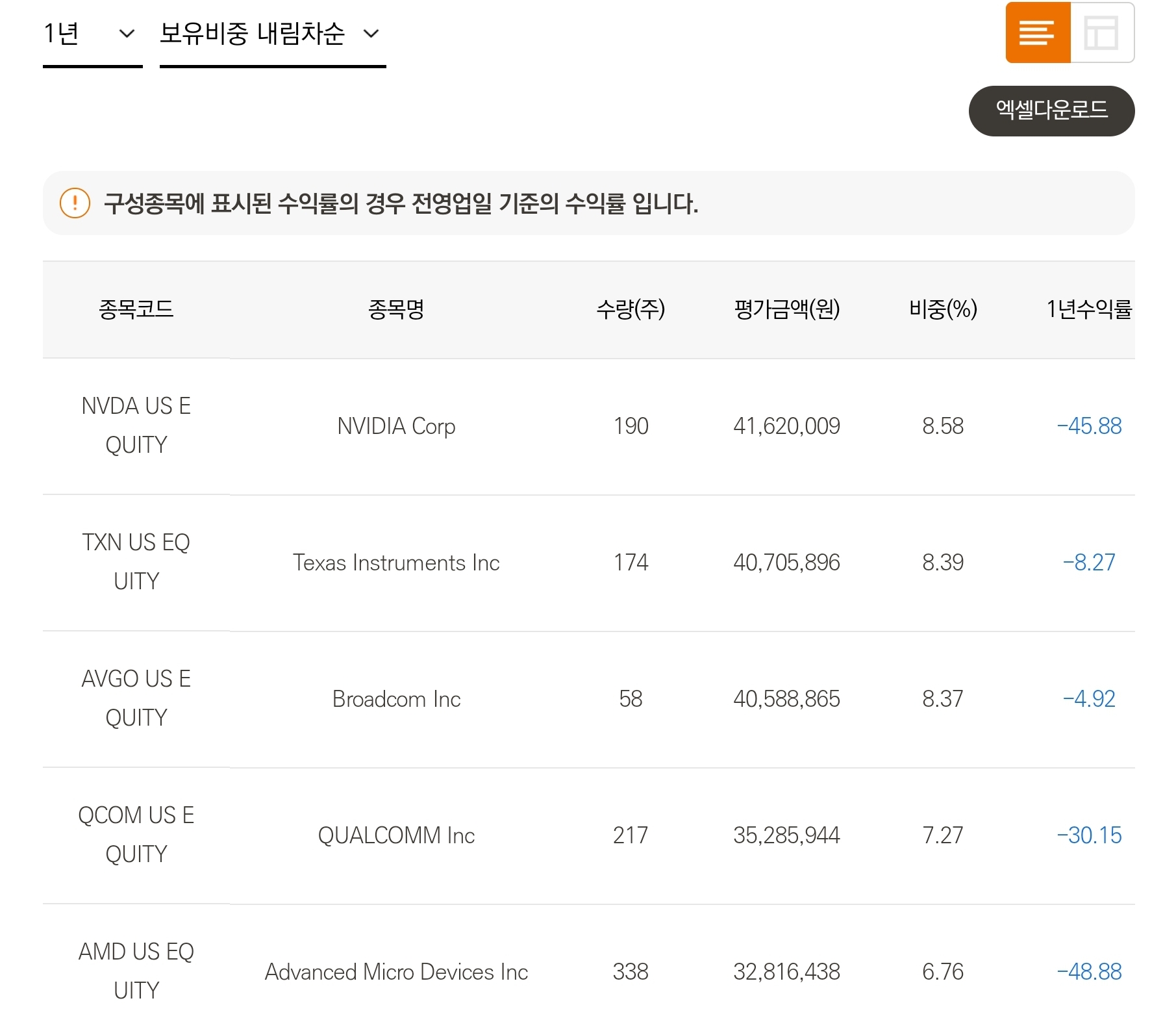반도체 관련 ETF 인 TIGER 미국필라델피아반도체나스닥 상품에서도 1년간 운용비중으로는 엔비디아 다음 두번째 비중으로 현재 차지하고 있다.
