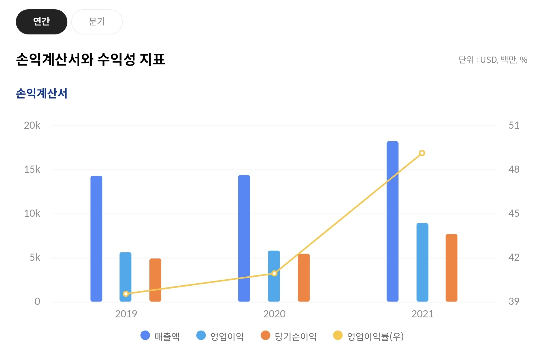 손익계산서와 수익성 측면에서도 21년도의 영업이익률이 증가폭이 커진것을 알 수 있다.