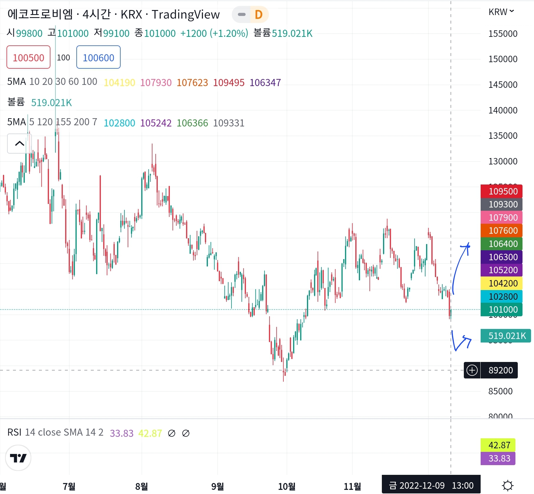에코프로비앰의 경우에도 어제의 위치에서 빠지지 않길 기대했는데 전체 적인 2차 전지 주들의 하락세를 피하지 못했다. 이제는 차라리 9만 원까지 바로 빠진 후 반등해서 올라와주길 더 기대해본다.