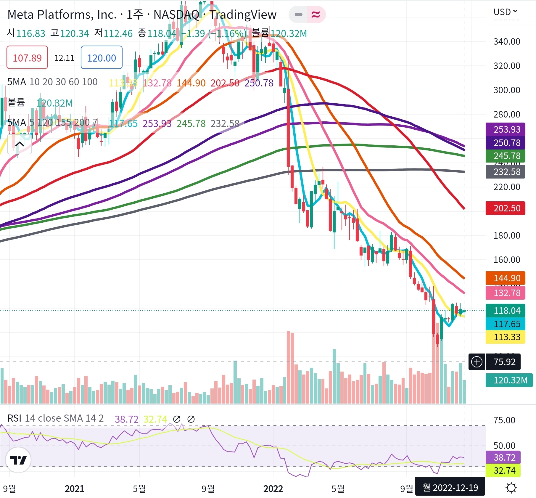 메타는 다행히 주봉 기준으로도 3일선 5일선 근처에서 아직 방향을 상승으로 틀진 않았지만 가능성은 보여주고 있는데 기술주들의 대세 하락으로 인해 쉽진 않을 것 같지만 기대는 해본다.