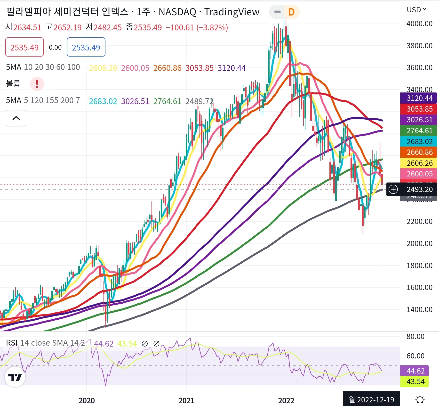 그나마 주봉 기준으로 200일선에 는 지지를 하고 있는 형국이기 때문에 기회일 수도 있고 내년 23년의 방향을 결정해주는 순간이 온것 같기도 하다. 내년도에 반도체가 정말 침체가 올 지 오더라도 지수가 더 빠질지는 걱정반 의심반인 것 같다.