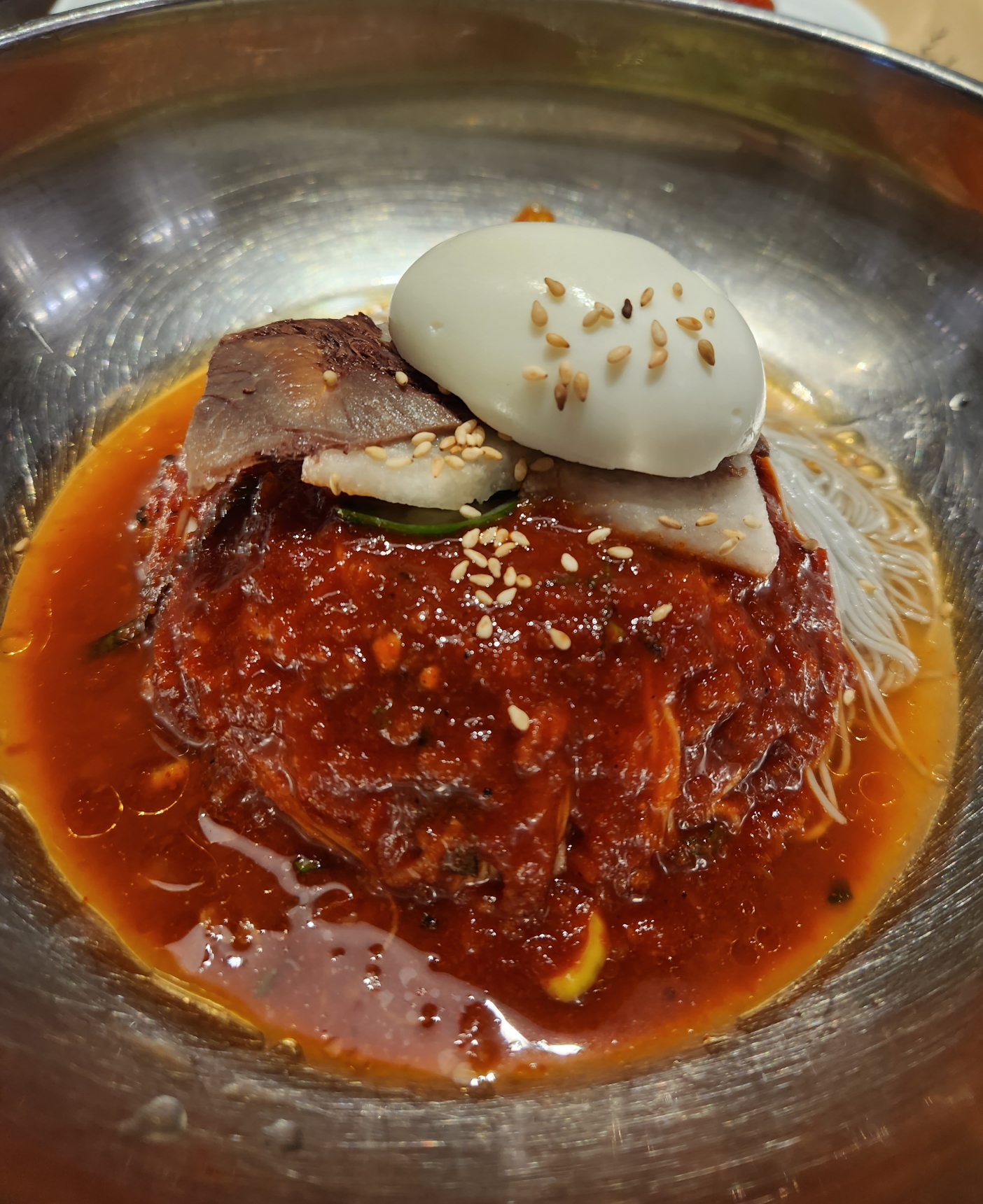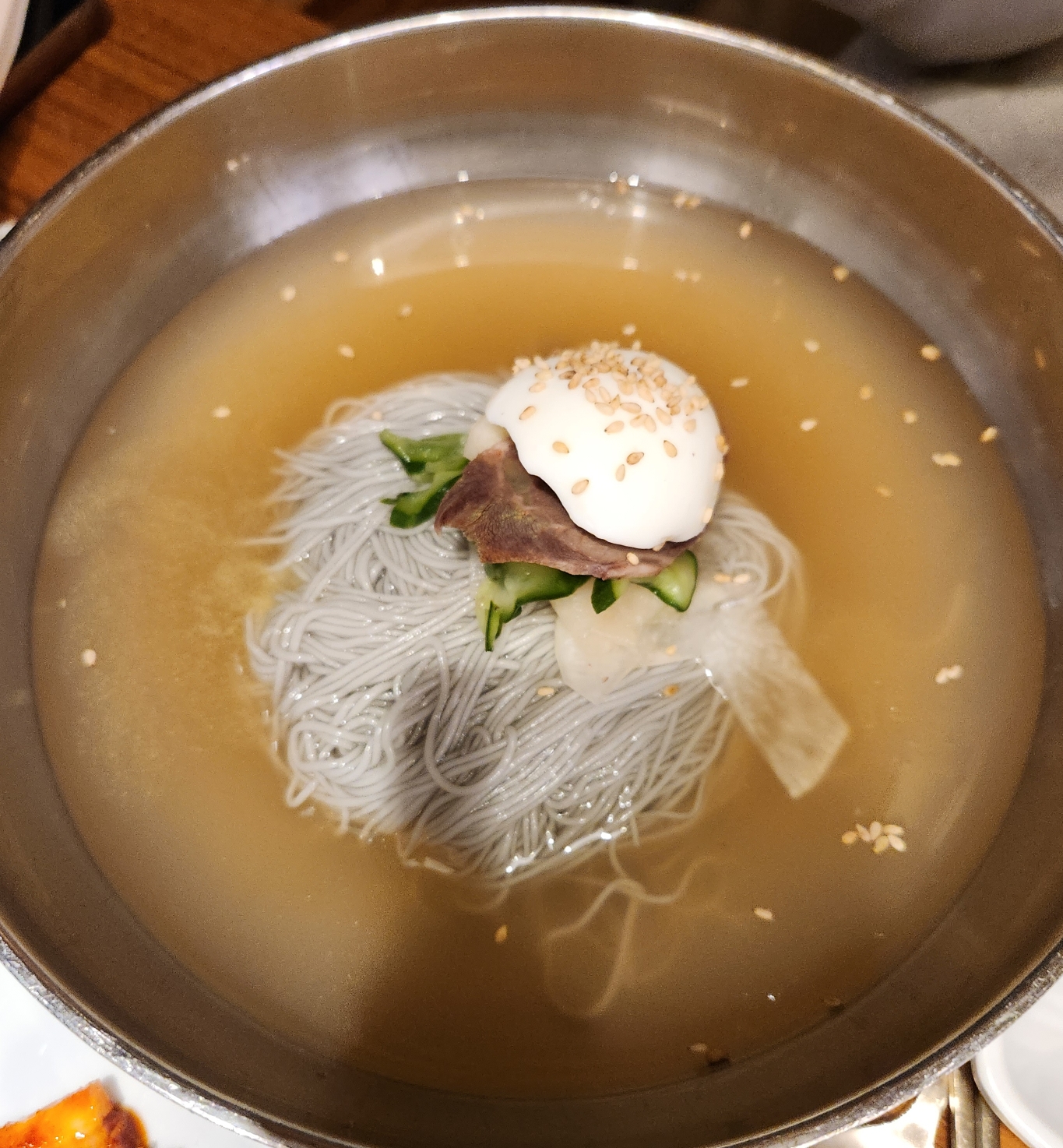 주문한 물 냉면과 취향에 따라 비빔냉면을 시켜 고기 한점에 면 한 젓가락 같이 싸서 먹으면 금상첨화이다.