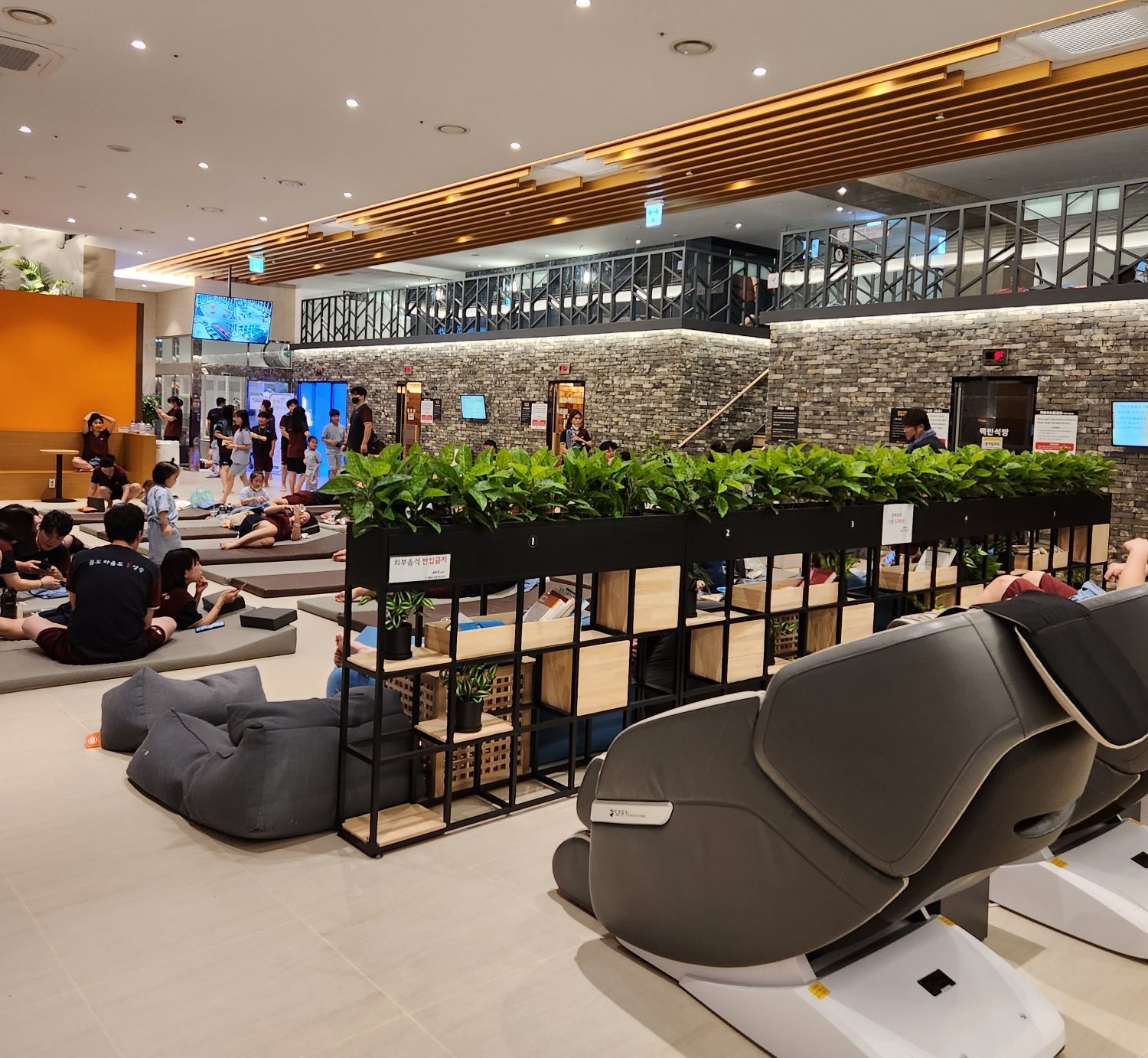 찜질방 가운데는 매트리스로 가족이나 일행끼리 누워 쉴 수 있게 배치되어 있고, 뒤쪽으로 소파, 그 뒤로 안마기도 줄지어 서있다. 창문 쪽으로는 테이블과 의자가 있어서 식사나 간식이용하기에도 좋아 보인다. 물론 식당 안에도 10 테이블정도는 넘게 있어서 이용하면 되지만 사람이 붐비땐 식당자리가 부족해 보이긴 한다.