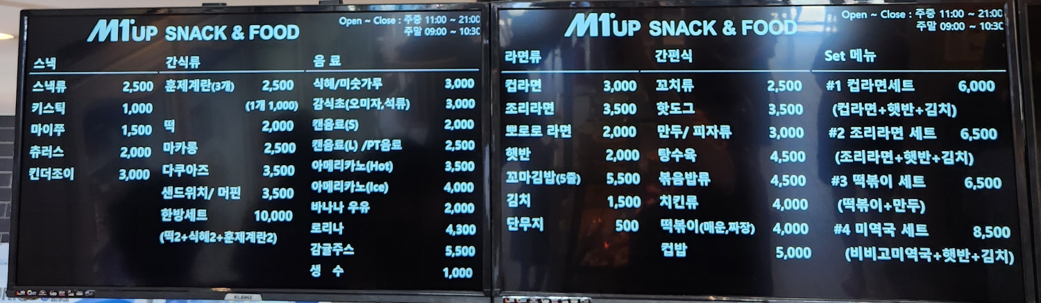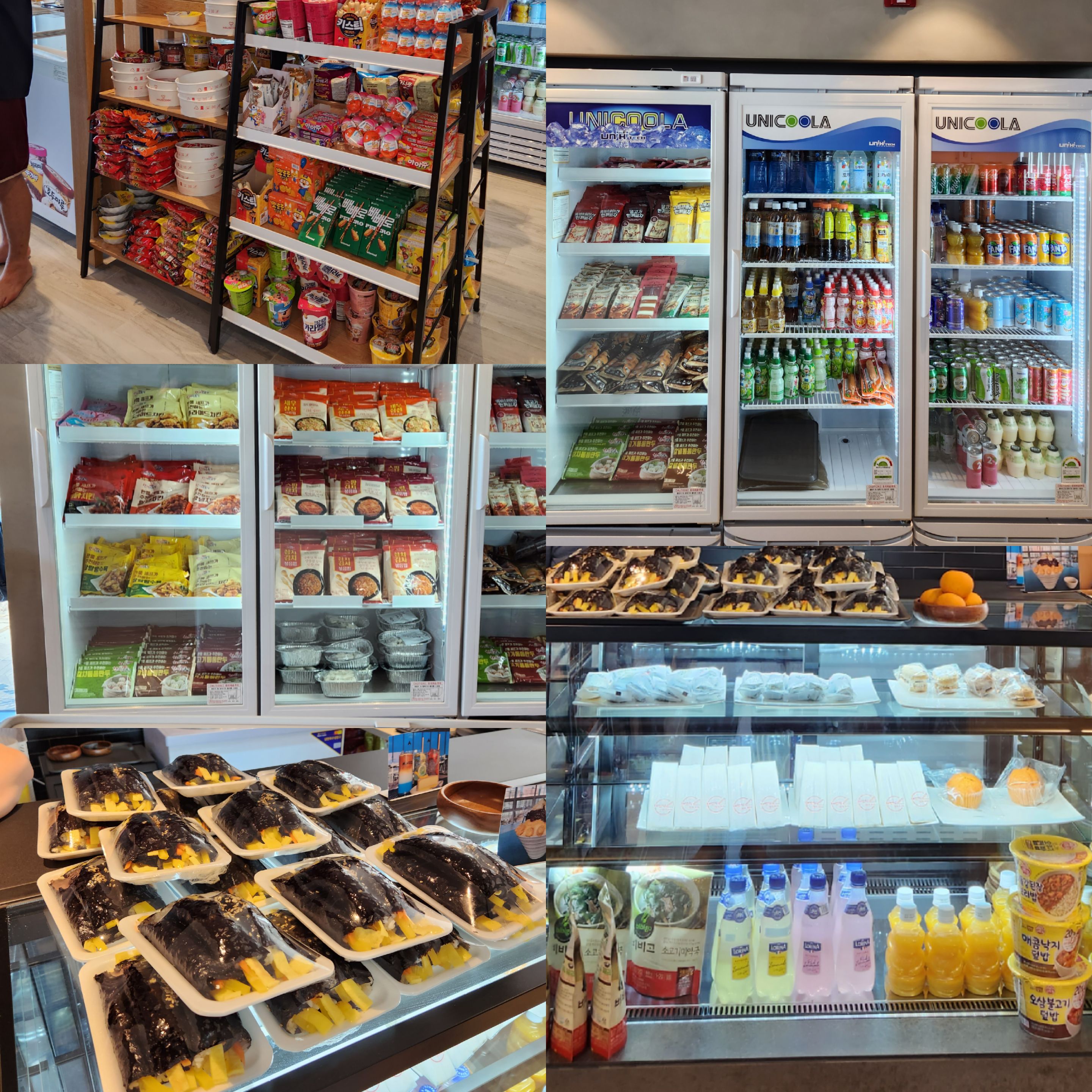 식당은 냉동식품부터 떡볶이, 컵라면, 조리라면, 김밥, 계란, 식혜, 귤등 왠만한 건 많이 있다.