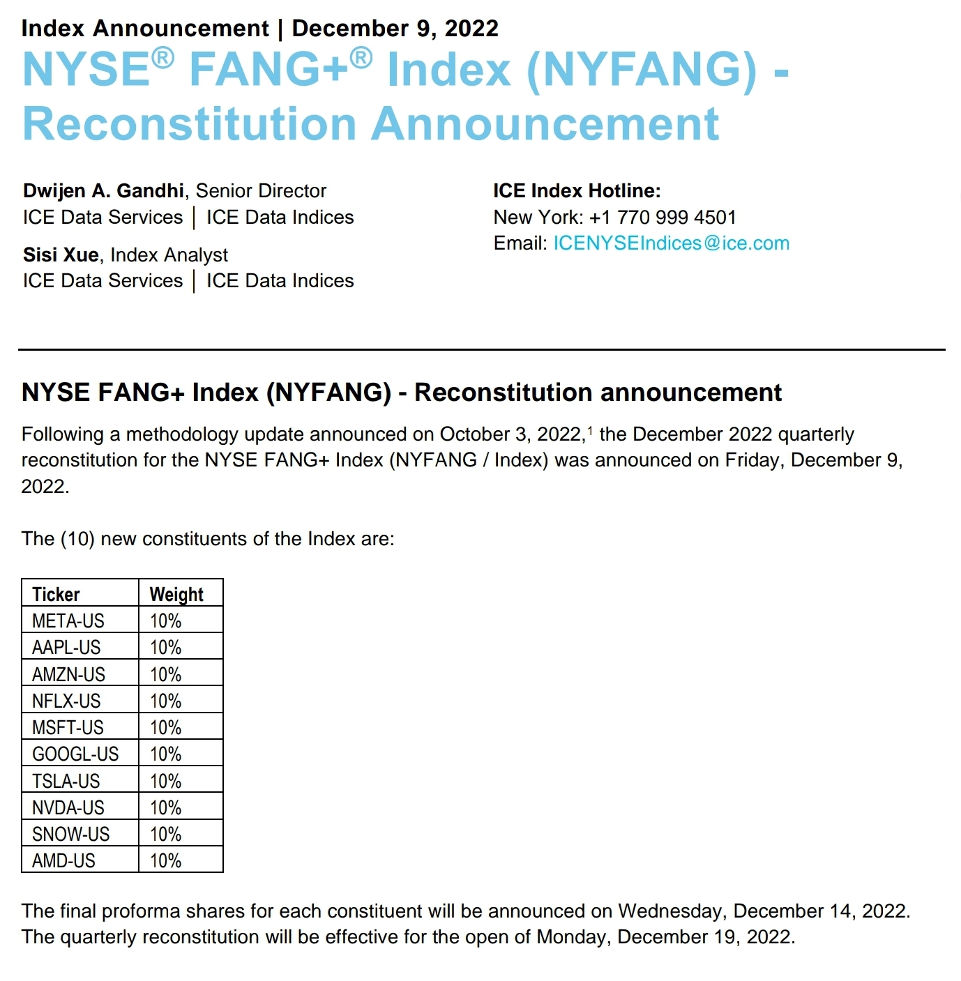 ICE 에서 최근 12월 9일에 변경예정 공지가 있었고, 12월 14일에 변경, 19일부터 효력발생에 대해 공지한 내용을 보면 아래 10개의 종목으로 변경되었다고 나온다.