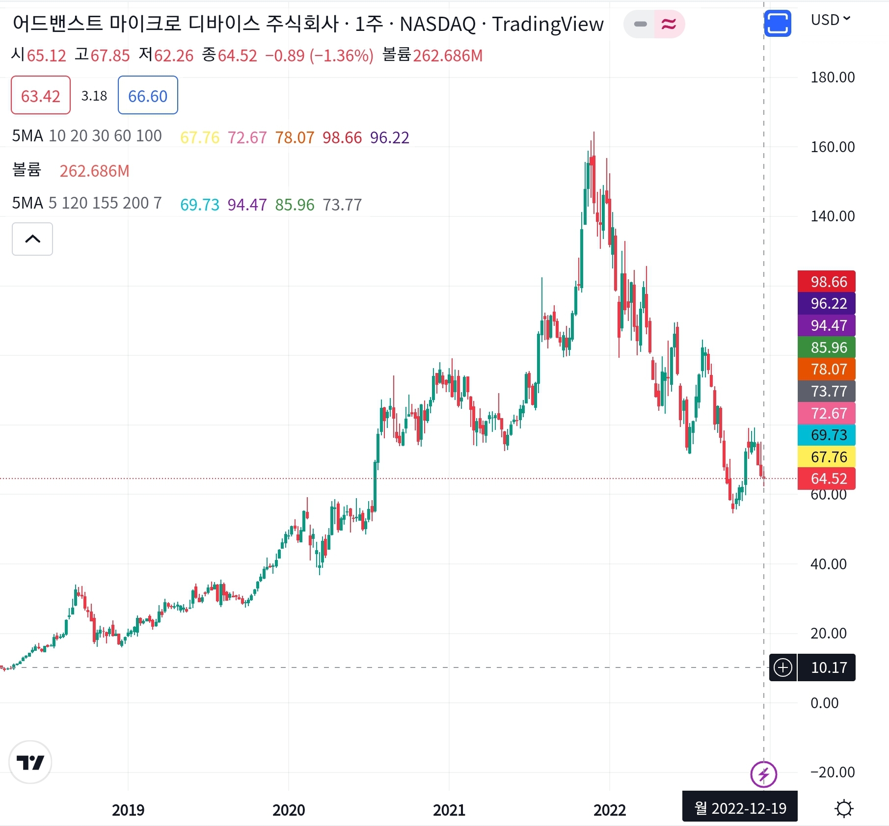 AMD 차트도 주봉상으로 많은 조정은 받았고 S&P500 지수가 앞으로 어떻게 될지에 따라 현재가 저점일지 추가 장기 하락으로 이어질지 유심히 지켜봐야할 것 같다.