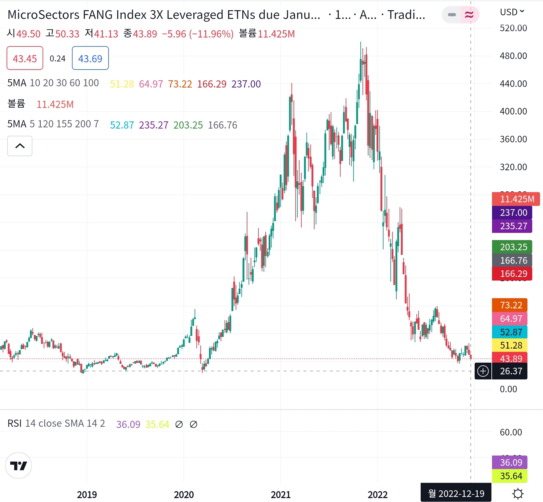 과거 FANG 지수 추종으로 한때 유행처럼 돌았던 ETF 인데 최근에는 기술주의 하락으로 수익률은 좋지 못한 ETF로 외면을 받고 있을 것 같다.