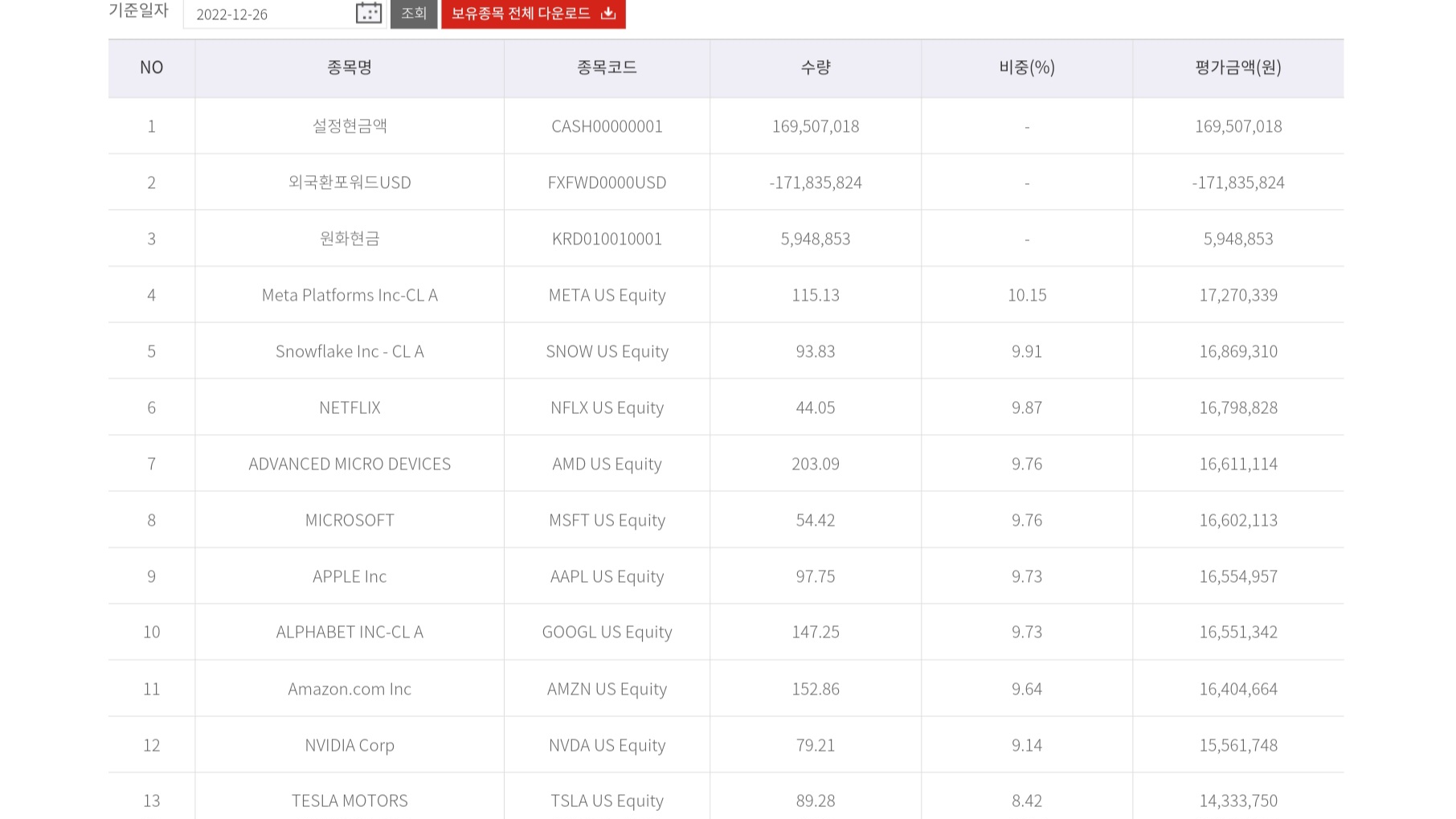 한때는 FANG 이라면 Facebook, Apple, Amazon, Netflix, Google 에 플러스로 테슬라, 알리바바, 바이두, 트위터 등 앞 글자를 따서 희망찬 종목들이 추가되어 기술 혁신에 대한 희망과 주식 우상향에 대한 폭발적인 인기가 있던 지수였기에 현재의 지수는 아쉬움이 크겠지만 , 최근 국내 ETF 최근 KODEX 미국 FANG 플러스(H) 종목을 확인해보다 그래도 아래와 같이 변화 되고 있는걸 확인했다.
