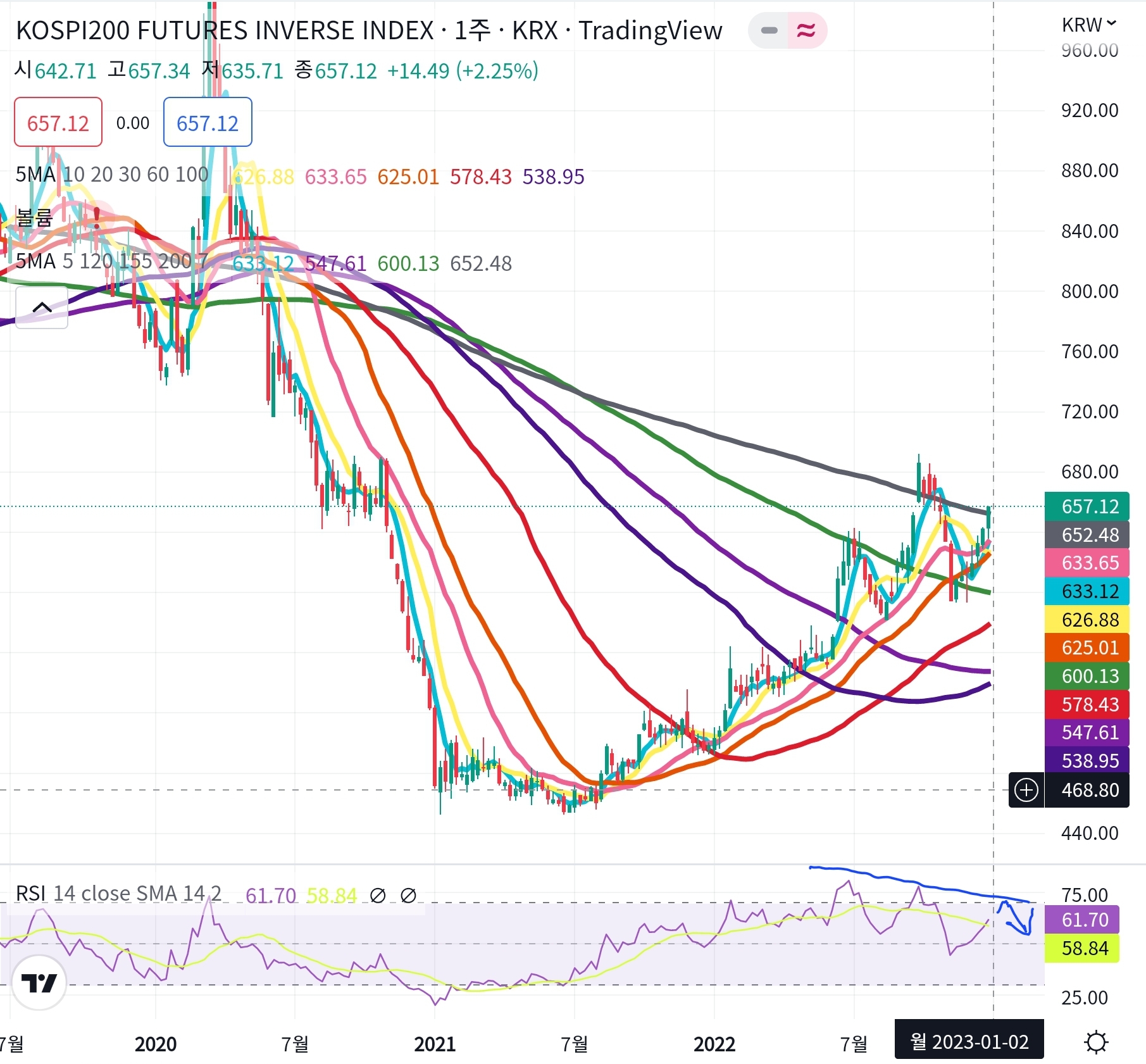 코스피 인버스 차트로 보면 주봉으로는 지난 저항구간을 뚫고 올라가고 있고 RSI 상 하락다이버전스가 만들어지고는 있어 보여 일이주 상승을 다시 하다가 내려오는 차트가 되지 않을까 한다.