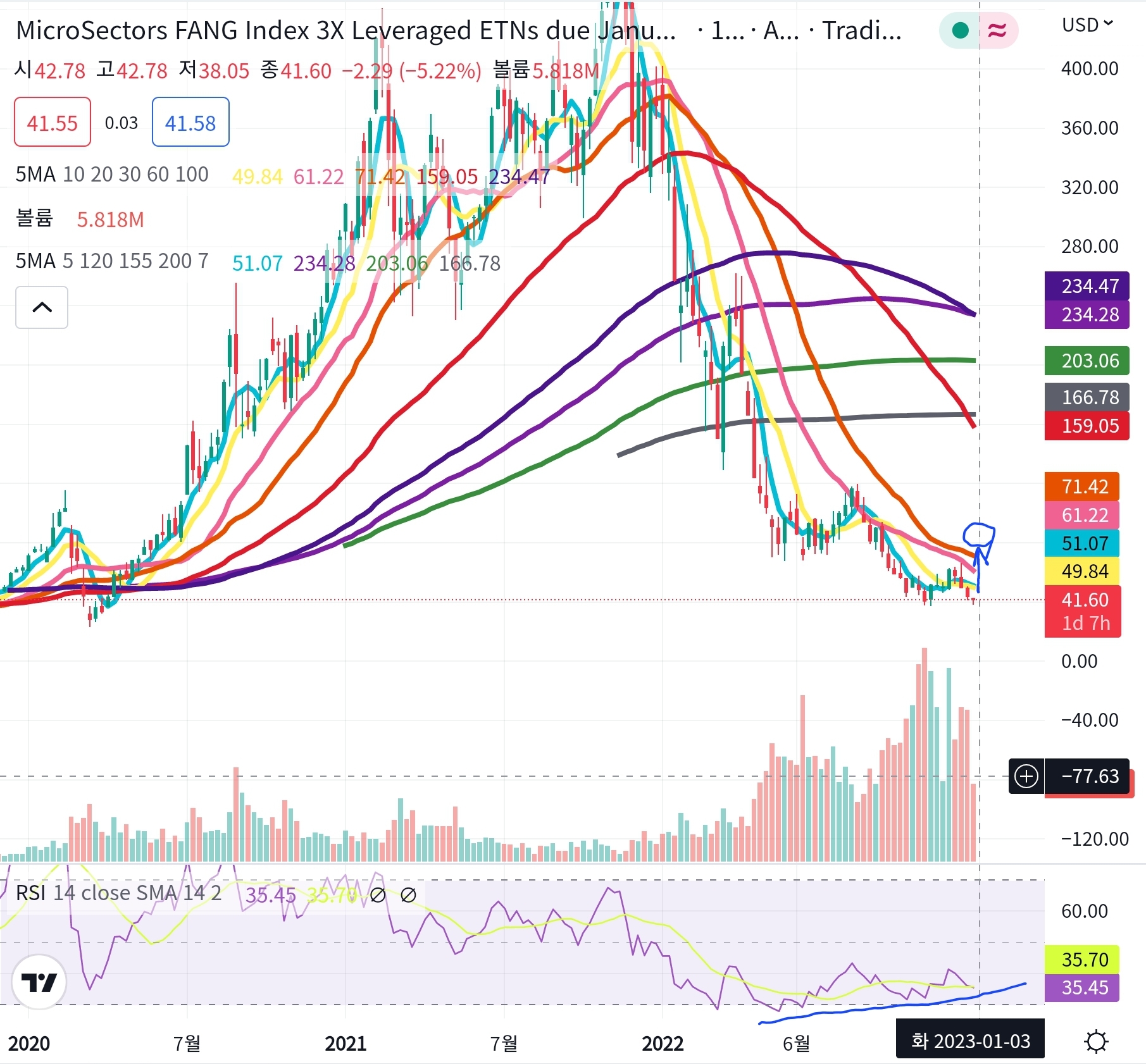 아래는 지난주부터 확인한 FANG 의 레버리지 FNGU 주봉 차트다.