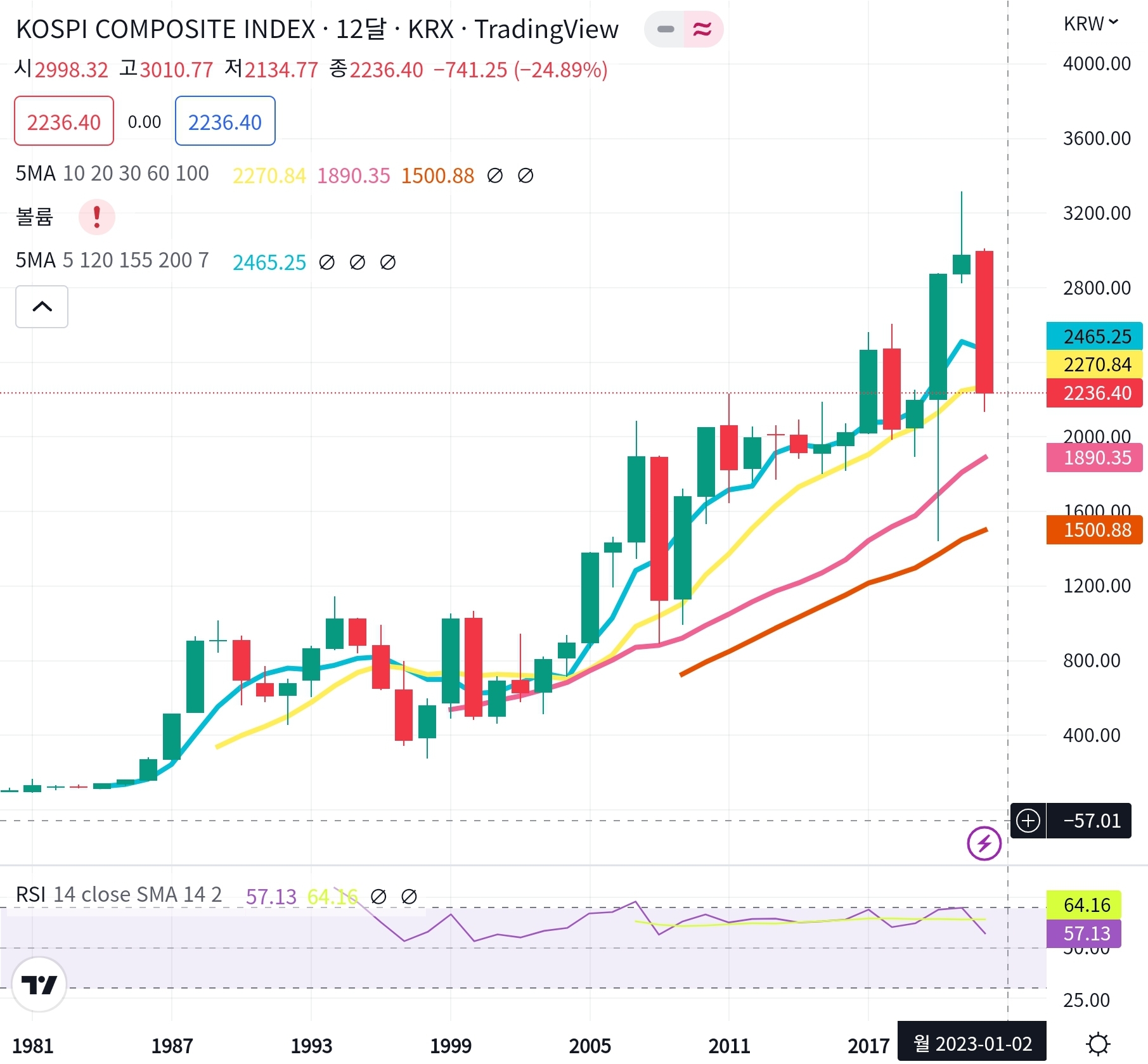 코스피 지수는 년봉 마감을 10일선에 걸쳐서 마감하였고, 20년 캔들의 저점의 위치에서 2236 지수에서 마감하였다. 내려가더라도 23년에는 5일선 까지는 다시 반등을 좀 하고 윗꼬리를 만들고 내려오지는 않을까 한다. 아니면 내려갔다가 살짝 올라올지 23년의 캔들은 크게 보면 큰 하락또는 횡보구간이지 않을까 싶다.