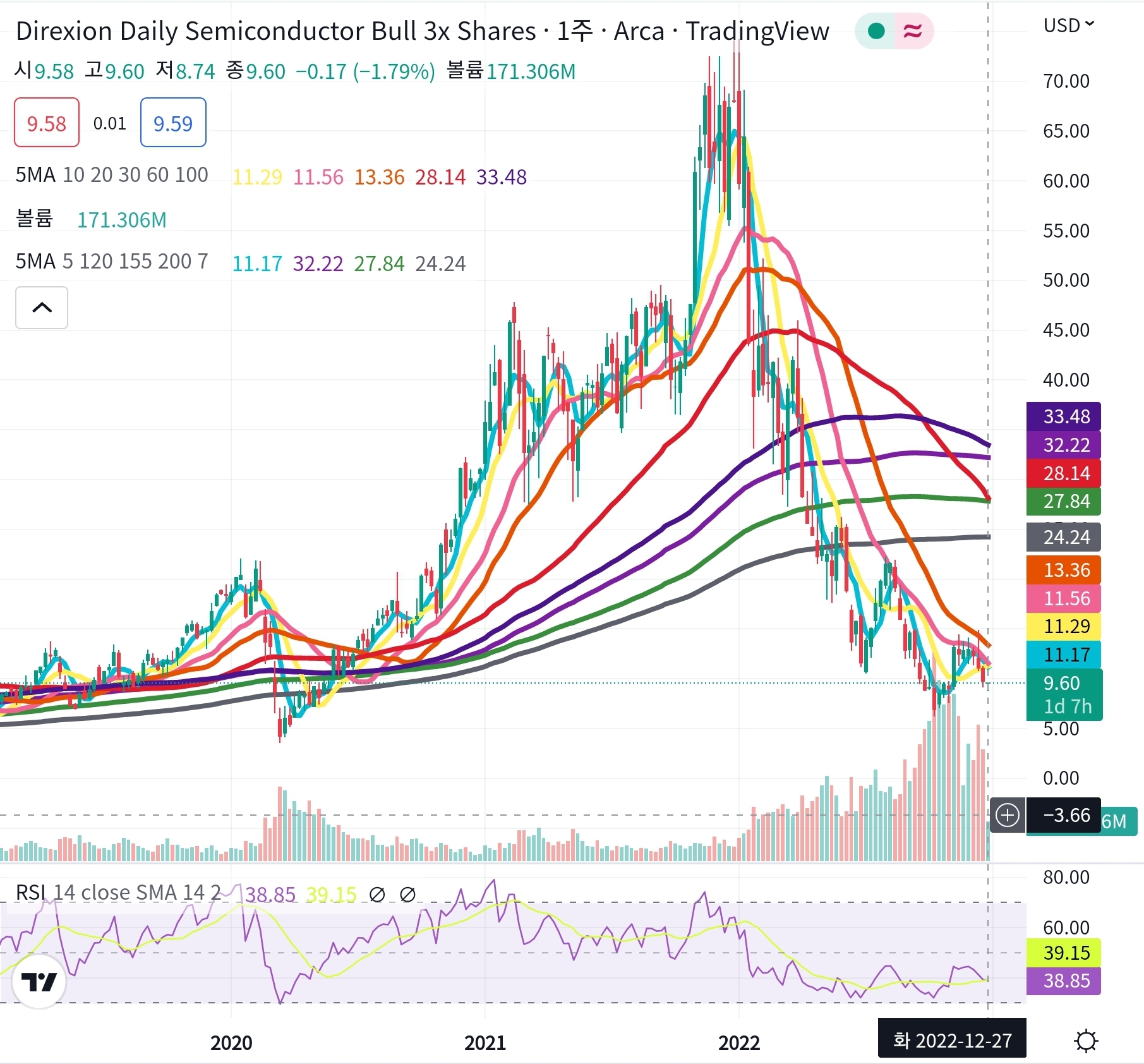 SOXL 의 차트를 봐도 주봉으로 바닥권에서 RSI 를 식혀주고 충분히 반등이 나올 수 있는 위치로 보고 SOXL 현재 9.6달러 정도는 매수 기회로 보여진다.