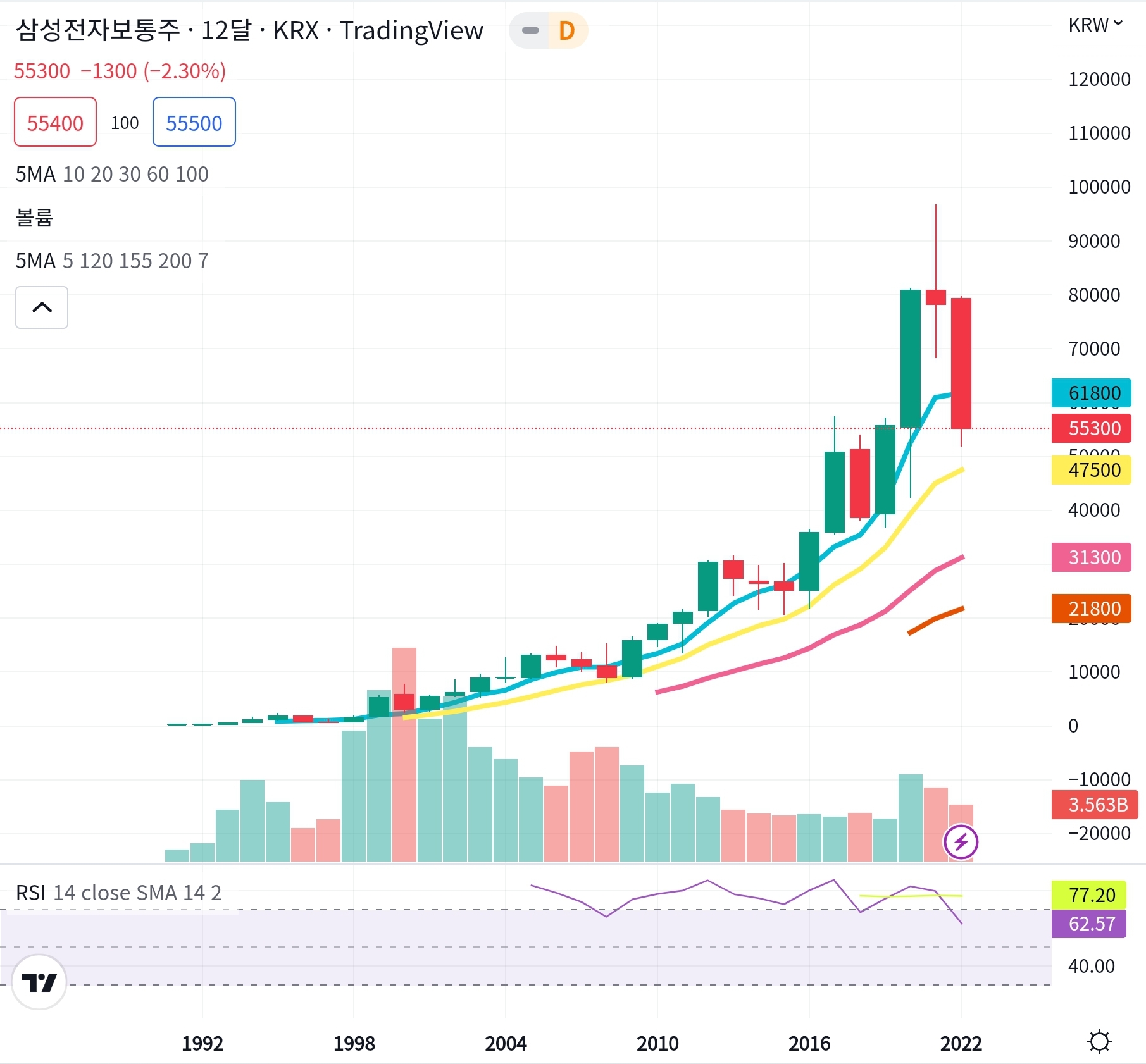 아니면 21년의 윗꼬리가 많이 길진 않기 때문에 23년은 다시 7만원 8만원 도전하는 모습이 나오지 않을까도 보인다.
