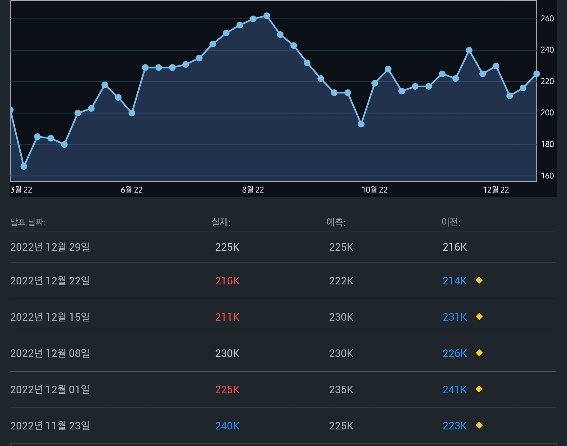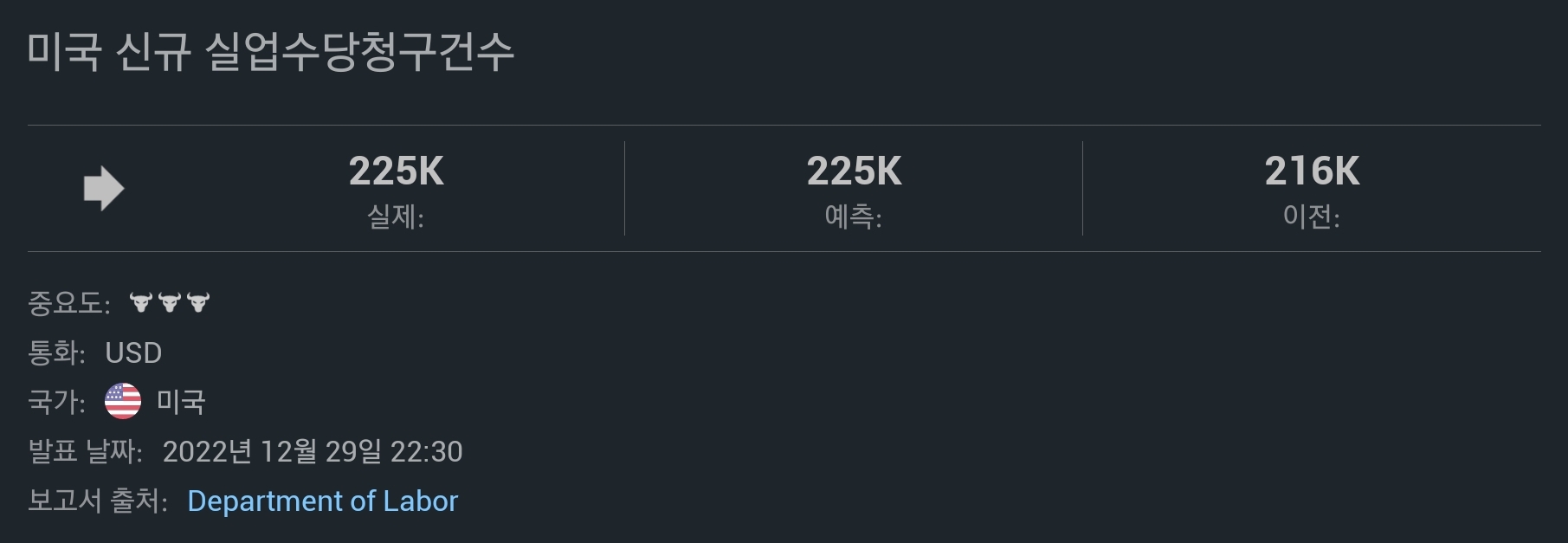29일 22시30분에는 미국신규실업수당 청구건수 발표도 있었는데 이건 예측치와 동일하게 나왔다.