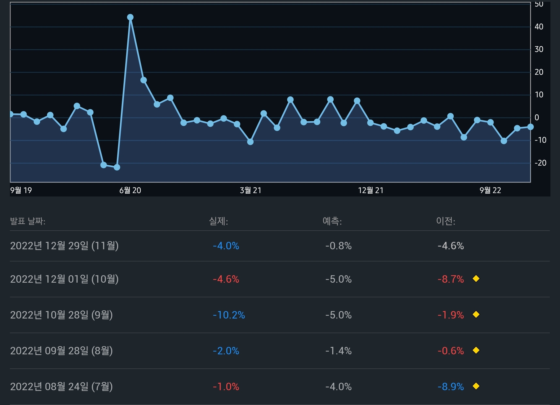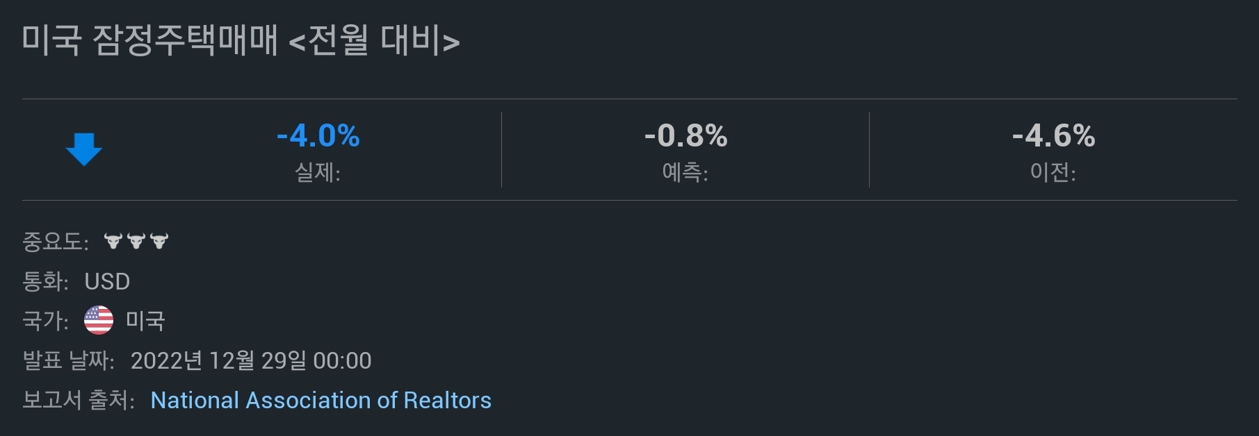 이번주는 미국잠정주택매매 발표가 있었다. 이전달 대비해서 예상치는 좋아지는 수치였으나 실제로는 이전달과 동등 수준인 -4.0%수준으로 주태매매에 대한 수요가 꺽여있다는 발표로 나왔다.
