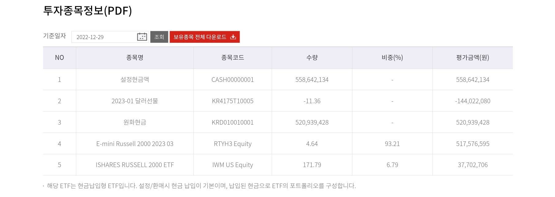 구성종목은 아래와 같이 단순하게 러셀2000 미국 상장된 시총 기준의 러셀 지수에 추종한다.